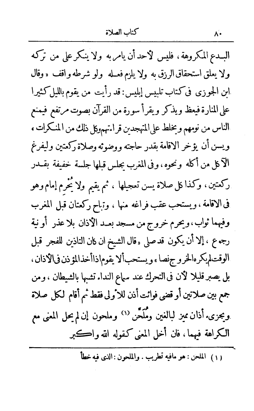 البدع المكروهة فليس لأحد أن يأمر به ولا ينكر على من تركه ولا يعلق استحقاق الرزق به ولا يلزم فعله ولو شرطه واقف وقال ابن الجوزي: في كتاب تلبيس إبليس: قد رأيت من يقوم بالليل كثيرا على المنارة فيعظ ويذكر ويقرأ سورة من القرآن بصوت مرتفع فيمنع الناس من نومهم ويخلط على المتهجدين قراءتهم وكل ذلك من المنكرات ويسن أن يؤخر الإقامة بقدر حاجته ووضوئه وصلاة ركعتين وليفرغ الأكل من أكله ونحوه وفي المغرب يجلس قبلها جلسة خفيفة بقدر ركعتين وكذا كل صلاة يسن تعجيلها ثم يقيم ولا يحرم إمام وهو في الإقامة ويستحب عقب فراغه منها وتباح ركعتان قبل المغرب وفيها ثواب ويحرم خروج من مسجد بعد الأذان بلا عذر أو نية رجوع إلا أن يكون قد صلى قال الشيخ: إن كان التأذين للفجر قبل الوقت لم يكره الخروج نصا ويستحب إلا يقوم إذا أخذ المؤذن في الأذان بل يصبر قليلا لأن في التحرك عند سماع النداء تشبها بالشيطان ومن جمع بين صلاتين أو قضى فوائت أذن للأولى فقط ثم أقام لكل صلاة ويجزئ آذان مميز لبالغين وملحن1 وملحون إن لم يحل المعنى مع الكراهة فيهما فإن أخل المعنى كقوله الله وأكبر،
