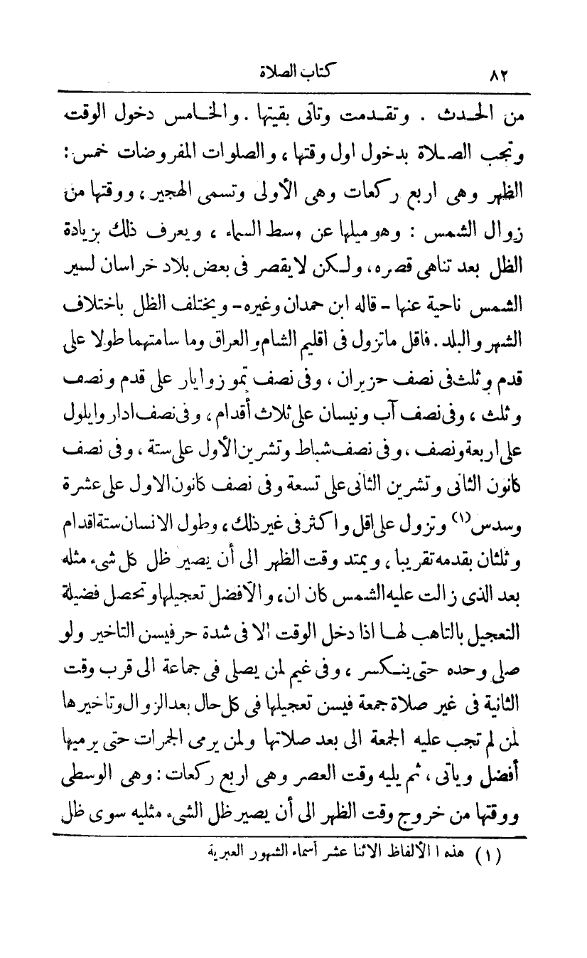 من الحدث وتقدمت وتأتى بقيتها والخامس دخول الوقت وتجب الصلاة بدخول أول وقتها والصلوات المفروضات خمس: الظهر وهي أربع ركعات وهي الأولى وتسمى الهجير ووقتها من زوال الشمس: وهو ميلها عن وسط السماء ويعرف ذلك بزيادة الظل بعد تناهى قصره ولكن لا يقصر في بعض بلاد خراسان لسير الشمس ناحية عنها ـ قاله ابن حمدان وغيره ـ ويختلف الظل باختلاف الشهر والبلد فأقل ما تزول في إقليم الشام والعراق وما سامتها طولا على قدم وثلث في نصف حزيران وفي نصف تموز وأيار على قدم ونصف وثلث وفي نصف آب ونيسان على ثلاث أقدام وفي نصف آذار وأيلول على أربعة ونصف وفي نصف شباط وتشرين الأول على ستة وفي نصف كانون الثاني وتشرين الثاني على تسعة وفي نصف كانون الأول على عشرة وسدس1 وتزول على أقل وأكثر في غير ذلك وطول الإنسان ستة أقدام وثلثان بقدمه تقريبا ويمتد وقت الظهر إلى أن يصير ظل كل شيء مثله بعد الذي زالت عليه الشمس إن كان والأفضل تعجيلها وتحصل فضيلة التعجيل بالتأهب لها إذا دخل الوقت إلا في شدة حر فيسن التأخير ولو صلى وحده حتى ينكسر وفي غيم لم يصلى في جماعة إلى قرب وقت الثانية ففي غير صلاة جمعة فيسن تعجيلها في كل حال بعد الزوال وتأخيرها لمن لم تجب عليه الجمعة إلى بعد صلاتها ولنم يرمى الجمرات حتى يرميها أفضل ويأتي ثم يليه وقت العصر وهي أربع ركعات: وهي الوسطى ووقتها من خروج وقت الظهر إلى أن يصير ظل الشيء مثليه سوى ظل