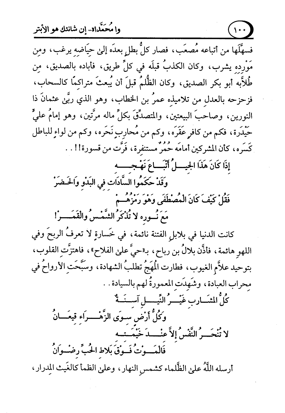 فسهَّلَها من أتباعه مُصعَب، فصار كلُّ بطلٍ بعدَه إلى حِيَاضِهِ يرغب، ومِن مَوْرِدِهِ يشرب، وكان الكذبُ قبلَه في كلِّ طريق، فأباده بالصديق، مِن طُلاَّبه أبو بكر الصديق، وكان الظُّلمُ قبلَ أن يُبعثَ متراكِمًا كالسحاب، فزحزحه بالعدلِ من تلاميذِه عمرُ بن الخطاب، وهو الذي ربَّى عثمانَ ذا النورين، وصاحبَ البيعتين، والمتصدِّقَ بكلِّ ماله مرَّتين، وهو إمامُ عليٍّ حَيْدَرة، فكم من كافرٍ عَقَرَه، وكم من مُحارِبٍ نَحَره، وكم من لواءٍ للباطل كَسَره، كأن المشركين أمامَه حُمُرٌ مستنفِرة، فَرَّت من قسورة!! ..