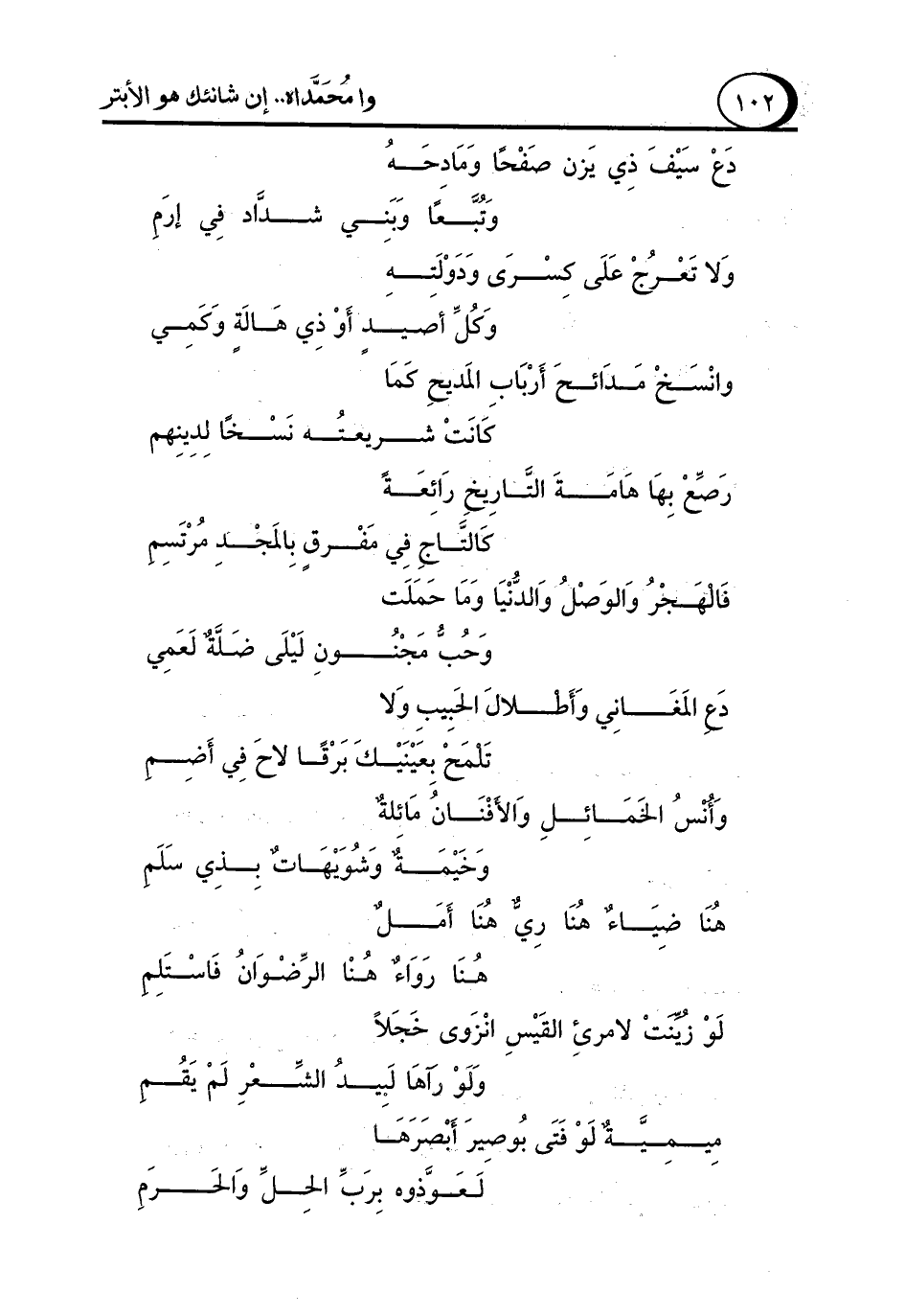 دع المَغَانِي وَأَطلالَ الحَبيبِ وَلا ... تَلمَح بِعَيْنَيْكَ بَرْقًا لاحَ فِي أَضِمِ