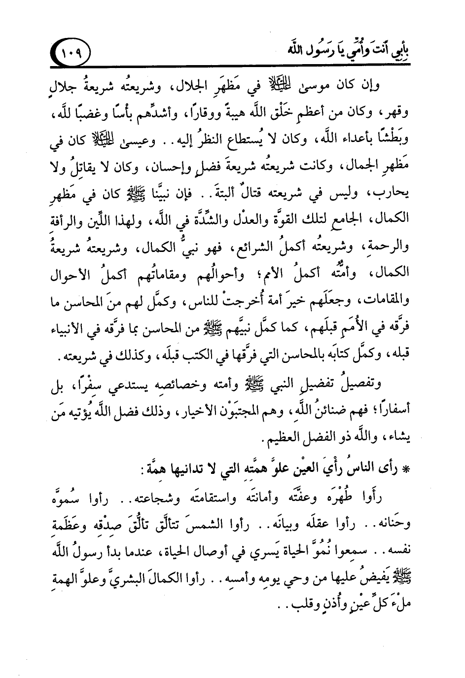 وإن كان موسى - عليه السلام - في مَظهَرِ الجلال، وشريعتُه شريعةُ جلالٍ وقهر، وكان من أعظم خَلْق الله هيبةً ووقارًا، وأشدِّهم بأْسًا وغضبًا لله، وبَطْشًا بأعداء الله، وكان لا يُستطاع النظرُ إليه .. وعيسى - عليه السلام - في مَظهرِ الجمال، وكانت شريعتُه شريعةَ فضلٍ وإحسان، وكان لا يقاتِلُ ولا يحارب، وليس في شريعته قتالٌ ألبتةَ .. فإن نبيَّنا - صلى الله عليه وسلم - كان في مَظهرِ الكمال، الجامعِ لتلك القوَّة والعدْل والشدَّة في الله، ولهذا اللِّين والرأفةِ والرحمةِ، وشريعتُه أكملُ الشرائع، فهو نبيُّ الكمال، وشريعتهُ شريعةُ الكمال، وأمته أكملُ الأمم؛ وأحوالُهم ومقاماتهم أكملُ الأحوال والمقامات، وجعَلَهم خيرَ أمة أُخرجتْ للناس، وكمَّل لهم منَ المحاسن ما فرَّقه في الأمَم قبلَهم، كما كمَّل نبيَّهم - صلى الله عليه وسلم - من المحاسن بما فرَّقه في الأنبياء قبله، وكمَّل كتابَه بالمحاسن التي فرَّقها في الكتب قبلَه، وكذلك في شريعته.