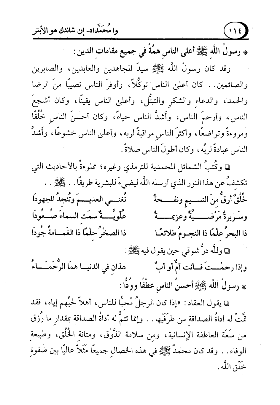 ° وكُتبُ الشمائل المحمدية للترمذي وغيره؛ مملوءة بالأحاديث التي تكشِفُ عن هذا النور الذي أرسله الله ليضيءَ للبشرية طريقًا .. - صلى الله عليه وسلم - ..