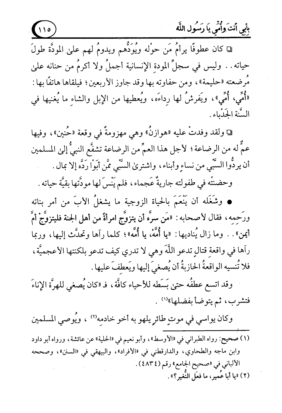 ° كان عطوفًا يرأمُ مَن حوْله ويُوَدُّهم ويدومُ لهم على المودَّة طولَ حياته .. وليس في سجلِّ المودةِ الإِنسانية أجملُ ولا أكرمُ من حنانه على مُرضعته "حليمة"، ومن حفاوته بها وقد جاوز الأربعين؛ فيلقاها هاتفًا بها: "أُمِّي، أُمِّي"، ويَفرشُ لها رِداءَه، ويُعطيها من الإِبل والشاءِ ما يُغنيها في السَّنة الجَدْباء.