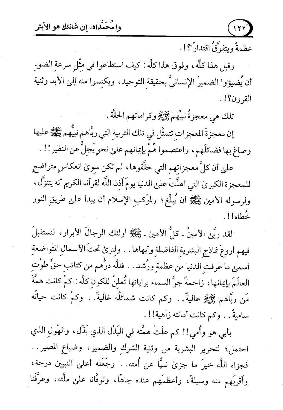 إن معجزةَ المعجزاتِ تتمثَّل في تلك التربيةِ التي ربَّاهم نبيُّهم - صلى الله عليه وسلم - عليها وصاغ بها فضائلَهم، واعتصموا هُمْ بإيمانهم على نحوٍ يَجِلُّ عن النظير!!.