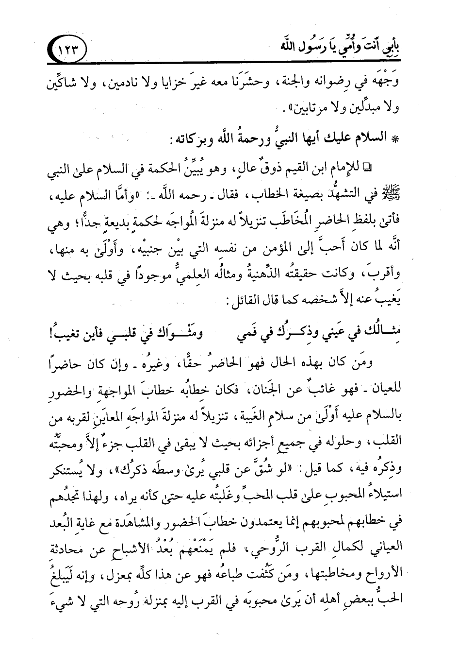 ومَن كان بهذه الحال فهو الحاضرُ حقًّا، وغيرُه -وإن كان حاضرًا للعيان- فهو غائبٌ عن الجَنان، فكان خِطابُه خطابَ المواجهةِ والحضورِ بالسلام عليه أَوْلَى من سلامِ الغَيبة، تنزيلاً له منزلةَ المواجَهِ المعايَنِ لقربه من القلب، وحلوله في جميع أجزائه بحيث لا يبقى في القلب جزءٌ إلاَّ ومحبَّته وذِكرُه فيه، كما قيل: "لو شُقَّ عن قلبي يُرى وسطَه ذكرُك"، ولا يُستنكر استيلاءُ المحبوبِ على قلب المحبِّ وغَلبتُه عليه حتى كأنه يراه، ولهذا تجدُهم في خطابهم لمحبوبهم إنما يعتمدون خطابَ الحضور والمشاهَدة مع غايةِ البُعد العياني لكمالِ القرب الرُّوحي، فلم يَمْنَعْهم بُعْدُ الأشباحِ عن محادثةِ الأرواح ومخاطبتها، ومَن كثُفت طباعُه فهو عن هذا كلِّه بمعزل، وإنه لَيَبلغُ الحبُّ ببعضِ أهلِه أن يَرى محبوبَه في القرب إليه بمنزلة رُوحه التي لا شيء