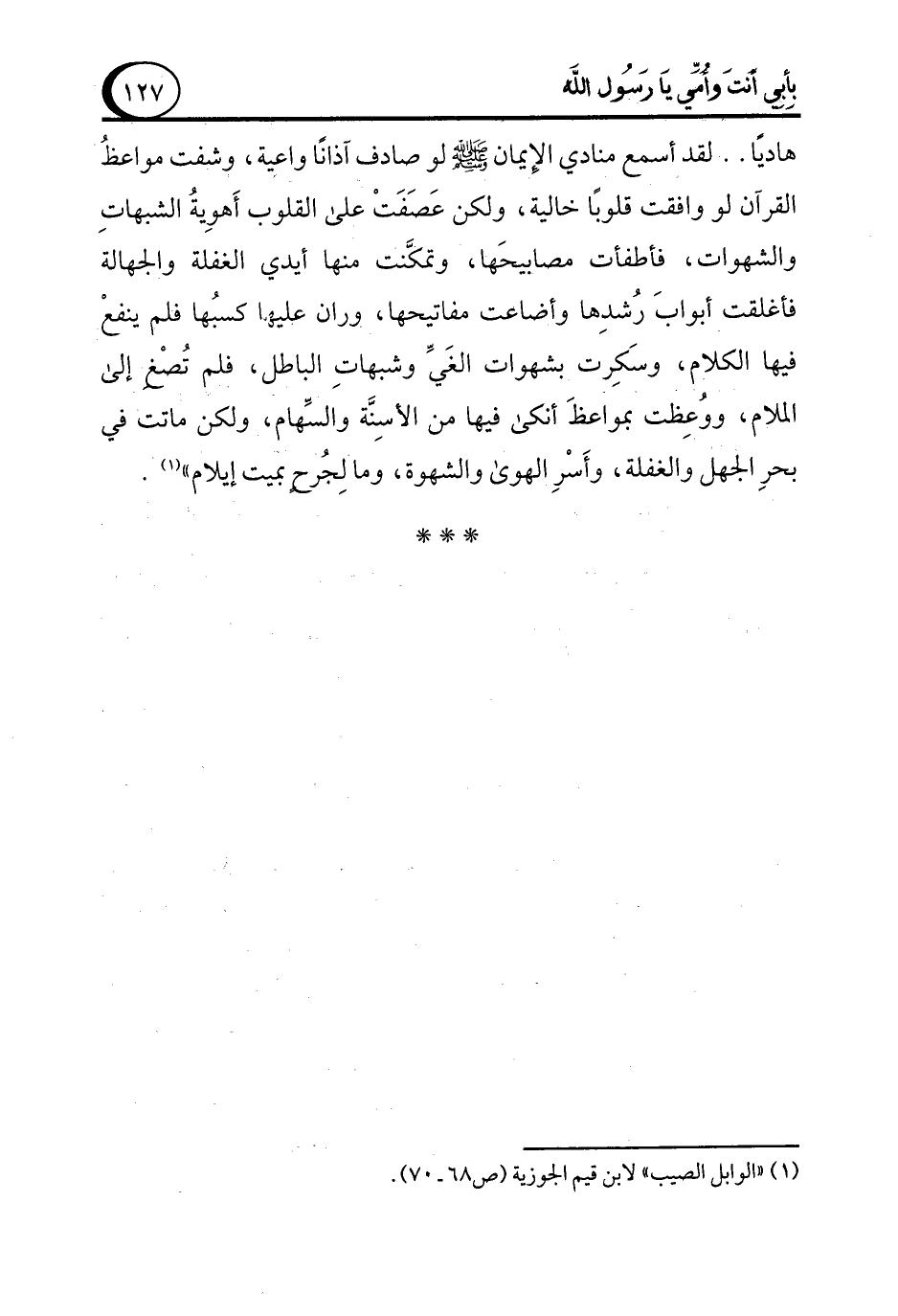 هاديًا .. لقد أسمع منادي الإيمان - صلى الله عليه وسلم - لو صادف آذانًا واعية، وشفت مواعظُ القرآن لو وافقت قلوبًا خالية، ولكن عَصَفَتْ على القلوب أَهوِيةُ الشبهاتِ والشهوات، فأطفأت مصابيحَها، وتمكَّنت منها أيدي الغفلة والجهالة فأغلقت أبوابَ رُشدِها وأضاعت مفاتيحها، وران عليها كسبُها فلم ينفعْ فيها الكلام، وسَكِرت بشهوات الغَيِّ وشبهاتِ الباطل، فلم تُصْغِ إلى الملام، ووُعِظت بمواعظَ أنكى فيها من الأسِنَّة والسِّهام، ولكن ماتت في بحرِ الجهل والغفلة، وأَسْرِ الهوى والشهوة، وما لِجُرحٍ بميت إيلام" (¬1).
