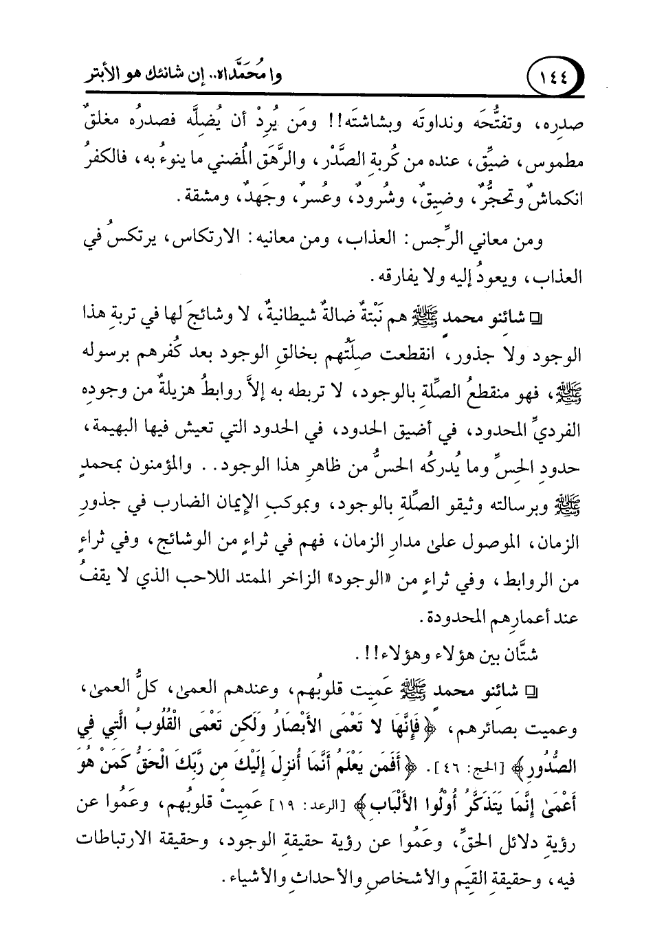 ° شائِنو محمدٍ - صلى الله عليه وسلم - هم نَبْتةٌ ضالةٌ شيطانيةٌ، لا وشائجَ لها في تربةِ هذا الوجود ولا جذور، انقطعت صِلتهم بخالقِ الوجود بعد كُفرهم برسوله - صلى الله عليه وسلم -، فهو منقطعُ الصِّلةِ بالوجود، لا تربطه به إلاَّ روابطُ هزيلةٌ من وجودِه الفرديِّ المحدود، في أضيق الحدود، في الحدود التي تعيش فيها البهيمة، حدودِ الحِسِّ وما يُدركُه الحسُّ من ظاهرِ هذا الوجود .. والمؤمنون بمحمدٍ - صلى الله عليه وسلم - وبرسالته وثيقو الصِّلةِ بالوجود، وبموكبِ الإِيمان الضارب في جذورِ الزمان، الموصول على مدارِ الزمان، فهم في ثراءٍ من الوشائج، وفي ثراءٍ من الروابط، وفي ثراءٍ من "الوجود" الزاخر الممتد اللاحب الذي لا يقفُ عند أعمارِهم المحدودة.