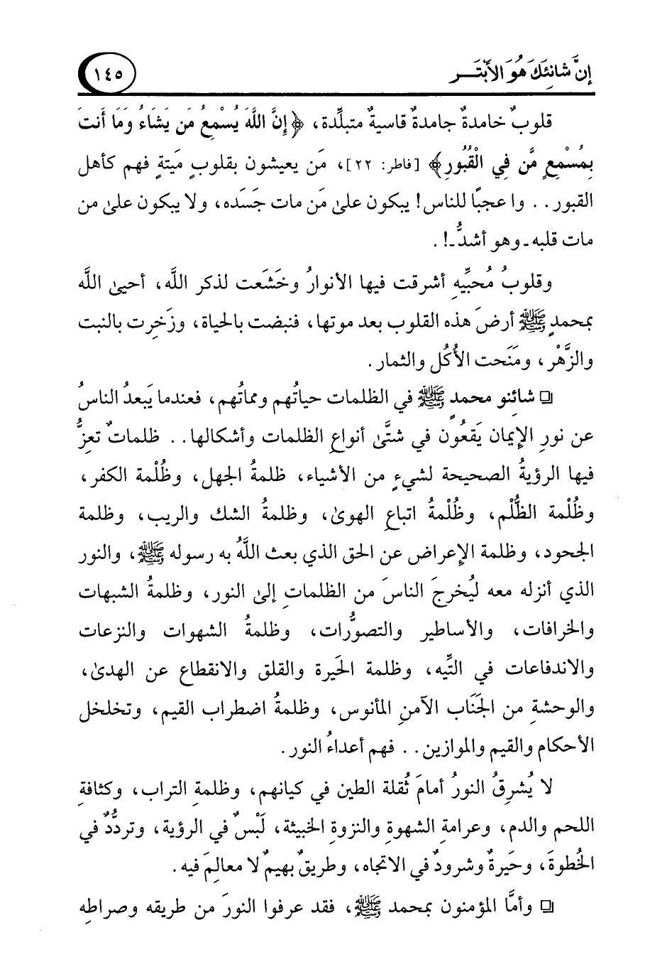° شائِنو محمدٍ - صلى الله عليه وسلم - في الظلمات حياتُهم ومماتُهم، فعندما يَبعدُ الناسُ عن نورِ الإيَمان يَقعُون في شتَّى أنواعِ الظلمات وأشكالها .. ظلماتٌ تعِزُّ فيها الرؤيةُ الصحيحة لشيءٍ من الأشياء، ظلمةُ الجهل، وظُلْمة الكفر، وظُلْمة الظُّلْم، وظُلْمةُ اتباع الهوى، وظلمةُ الشك والريب، وظلمة الجحود، وظلمة الإِعراض عن الحق الذي بعث الله به رسوله - صلى الله عليه وسلم -، والنور الذي أنزله معه ليُخرجَ الناسَ من الظلماتِ إلى النور، وظلمةُ الشبهات والخرافات، والأساطير والتصوُّرات، وظلمةُ الشهوات والنزعات والاندفاعات في التِّيه، وظلمة الحَيرة والقلق والانقطاع عن الهدى، والوحشةِ من الجَنَاب الآمنِ المأنوس، وظلمة اضطراب القيم، وتخلخل الأحكام والقيم والموازين .. فهم أعداءُ النور.
