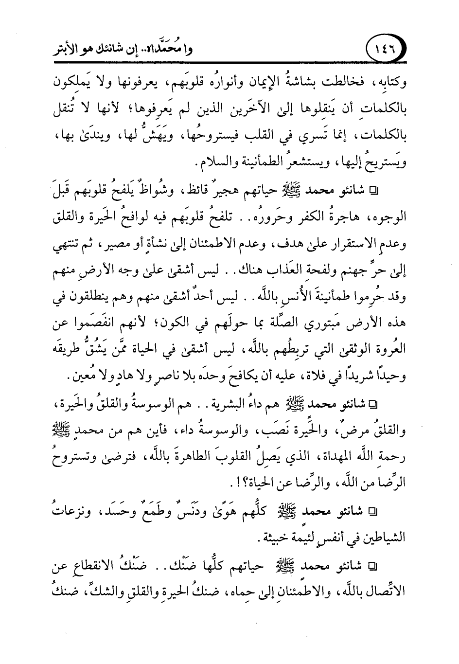 ° شانئو محمد - صلى الله عليه وسلم - هم داءُ البشرية .. هم الوسوسةُ والقلقُ والحَيرة، والقلقُ مرضٌ، والحَيرة نَصَب، والوسوسةُ داء، فأين هم من محمدٍ - صلى الله عليه وسلم - رحمةِ الله المهداة، الذي يَصِلُ القلوبَ الطاهرةَ بالله، فترضى وتستروحُ الرِّضا من الله، والرِّضا عن الحياة؟!.