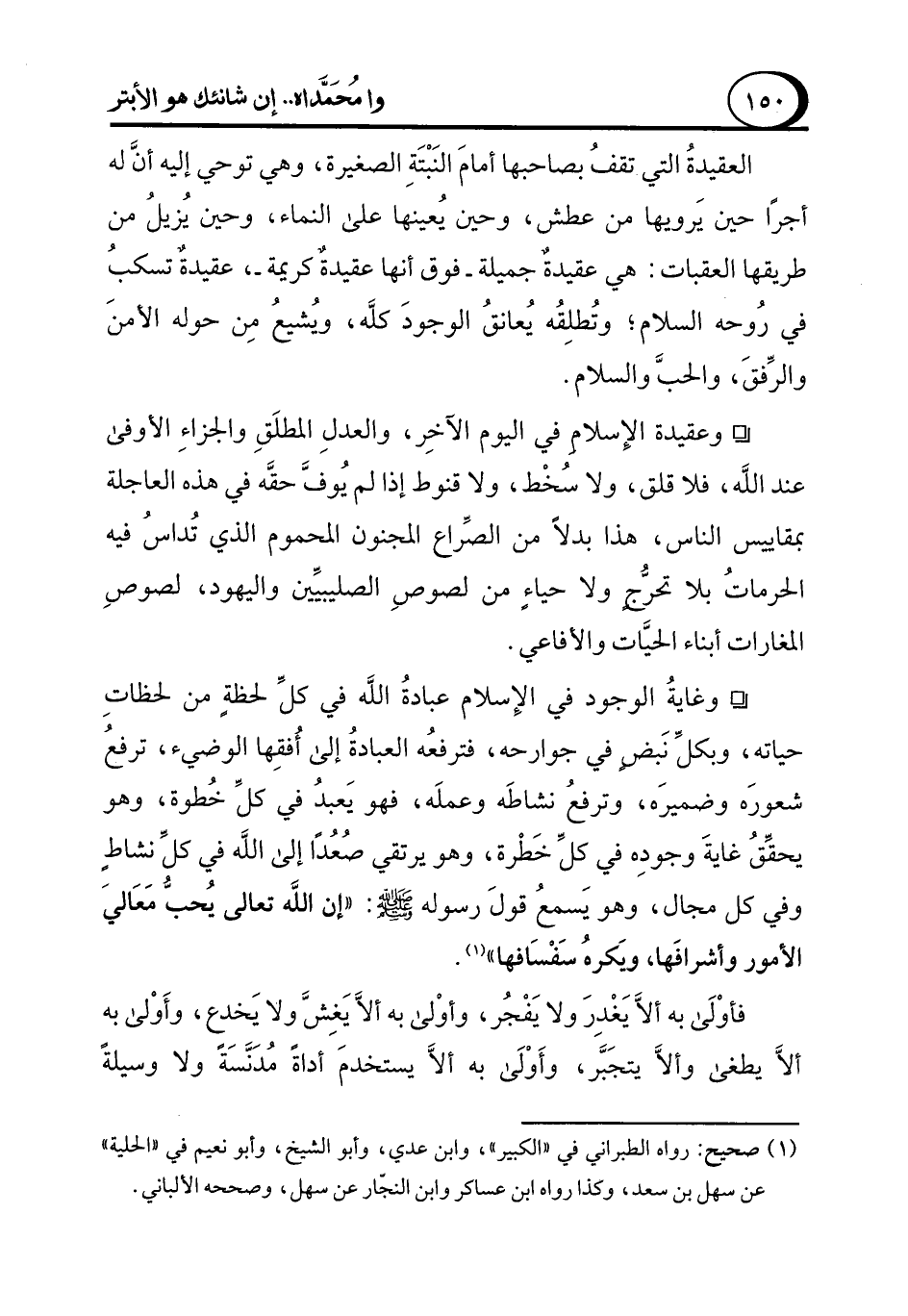 ° وغايةُ الوجود في الإِسلام عبادةُ الله في كلِّ لحظةٍ من لحظاتِ حياته، وبكلِّ نَبضٍ في جوارحه، فترفعُه العبادة إلى أُفقِها الوضيء، ترفعُ شعورَه وضميرَه، وترفعُ نشاطَه وعملَه، فهو يَعبدُ في كلِّ خُطوة، وهو يحقِّقُ غايةَ وجودِه في كلِّ خَطْرة، وهو يرتقي صُعُدًا إلى الله في كلِّ نشاطٍ وفي كل مجال، وهو يَسمعُ قولَ رسوله - صلى الله عليه وسلم -: "إن الله تعالى يُحبُّ مَعَاليَ الأمور وأشرافَها، ويَكرهُ سَفْسَافها" (¬1).