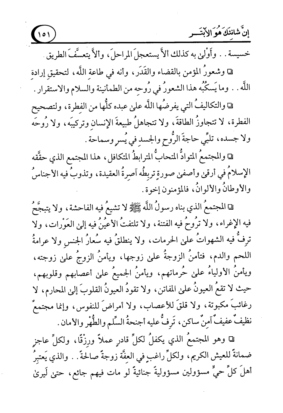 ° المجتمعُ الذي بناه رسولُ الله - صلى الله عليه وسلم - لا تشيعُ فيه الفاحشة، ولا يتبجَّحُ فيه الإغراء، ولا ترُوحُ فيه الفتنة، ولا تلتفتُ الأعيُنُ فيه إلى العَوْرات، ولا ترِفُّ فيه الشهواتُ على الحرمات، ولا ينطلقُ فيه سُعارُ الجنسِ ولا عرامةُ اللحم والدم، فتأمنُ الزوجةُ على زوجها، ويأمنُ الزوجُ على زوجته، ويأمنُ الأولياءُ على حُرماتهم، ويأمنُ الجميعُ على أعصابهم وقلوبهم، حيث لا تقعُ العيونُ على المفاتن، ولا تقودُ العيونُ القلوبَ إلى المحارم، لا رغائبَ مكبوتة، ولا قلقَ للأعصاب، ولا أمراضَ للنفوس، وإنما مجتمعٌ نظيف عفيفٌ آمِنٌ ساكن، تَرِفُّ عليه أجنحةُ السِّلم والطُّهْر والأمان.