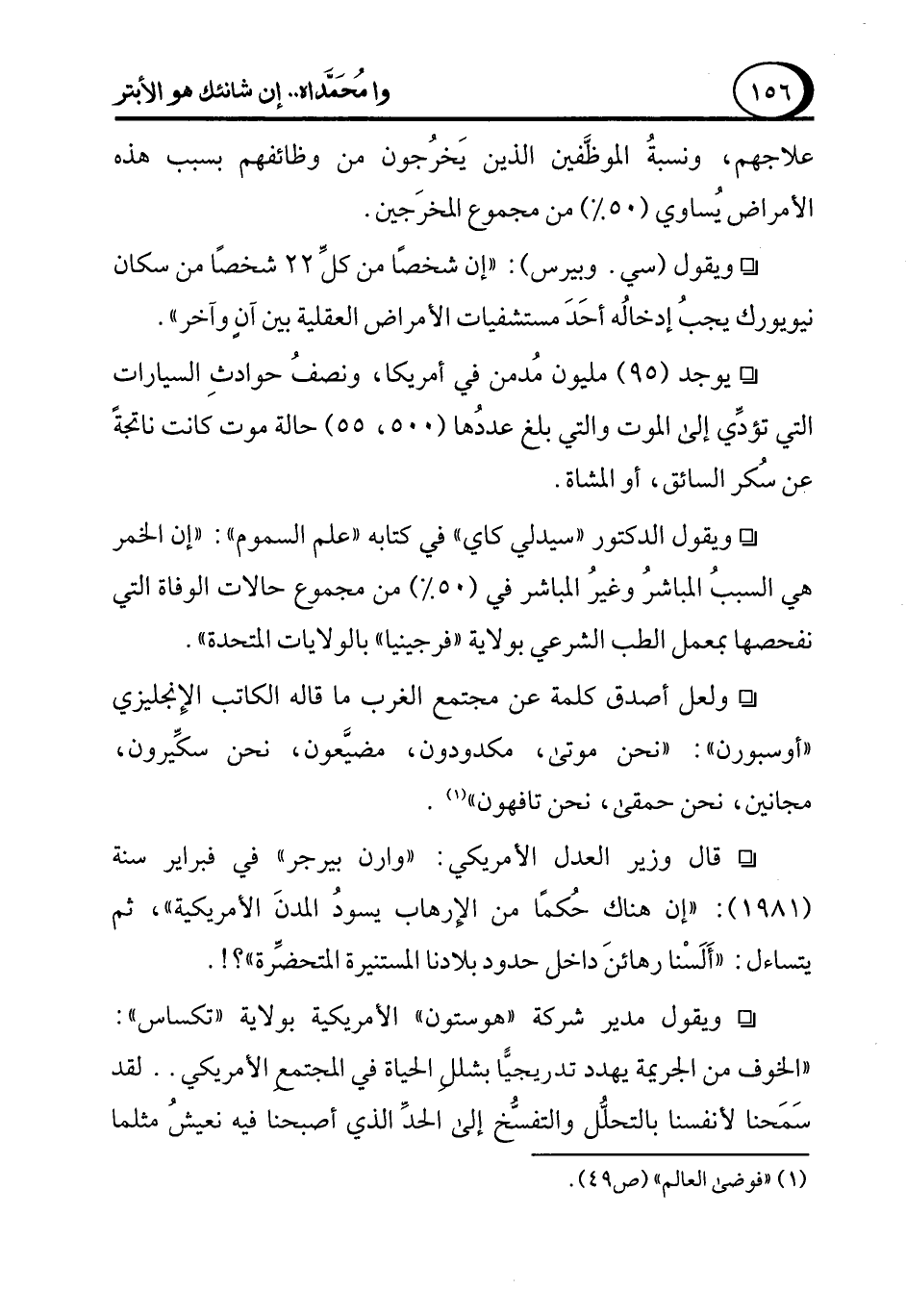 ° ويقول مدير شركة "هوستون" الأمريكية بولاية "تكساس": "الخوف من الجريمة يهدد تدريجيًّا بشلل الحياة في المجتمعِ الأمريكي .. لقد سَمَحنا لأنفسنا بالتحلُّل والتفسُّخ إلى الحدِّ الذي أصبحنا فيه نعيشُ مثلما