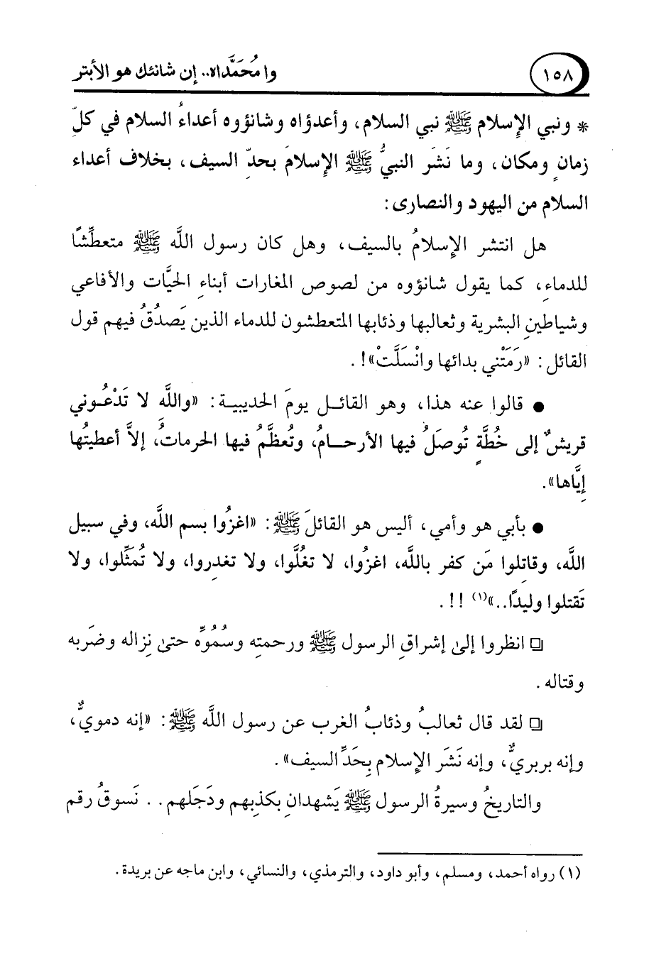 * ونبي الإِسلام - صلى الله عليه وسلم - نبي السلام، وأعدؤاه وشانؤوه أعداء السلام في كلِّ زمانٍ ومكان، وما نَشَر النبيُّ - صلى الله عليه وسلم - الإِسلامَ بحدِّ السيف، بخلاف أعداء السلام من اليهود والنصارى: