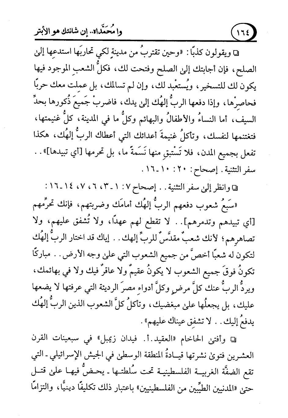 ° ويقولون كذبًا: "وحين تقتربُ من مدينةٍ لكي تحاربَها استدعِها إلى الصلح، فإن أجابتك إلى الصلح وفتحت لك، فكلّ الشعبِ الموجود فيها يكون لك للتسخير، ويُستعْبد لك، وإن لم تسالمك، بل عمِلت معك حربًا فحاصِرْها، وإذا دفعها الربّ إلهُك إلى يدك، فاضربْ جَميعَ ذكررها بحدِّ السيف، أما النساءُ والأطفالُ والبهائم وكلُّ ما في المدينة، كلّ غنيمتها، فتغتنمها لنفسك، وتأكلُ غنيمةَ أعدائك التي أعطاك الربّ إلهك، هكذا تفعل بجميع المدن، فلا تَسْتبقِ منها نَسَمةً ما، بل تحرمها [أي تبيدها] " ..