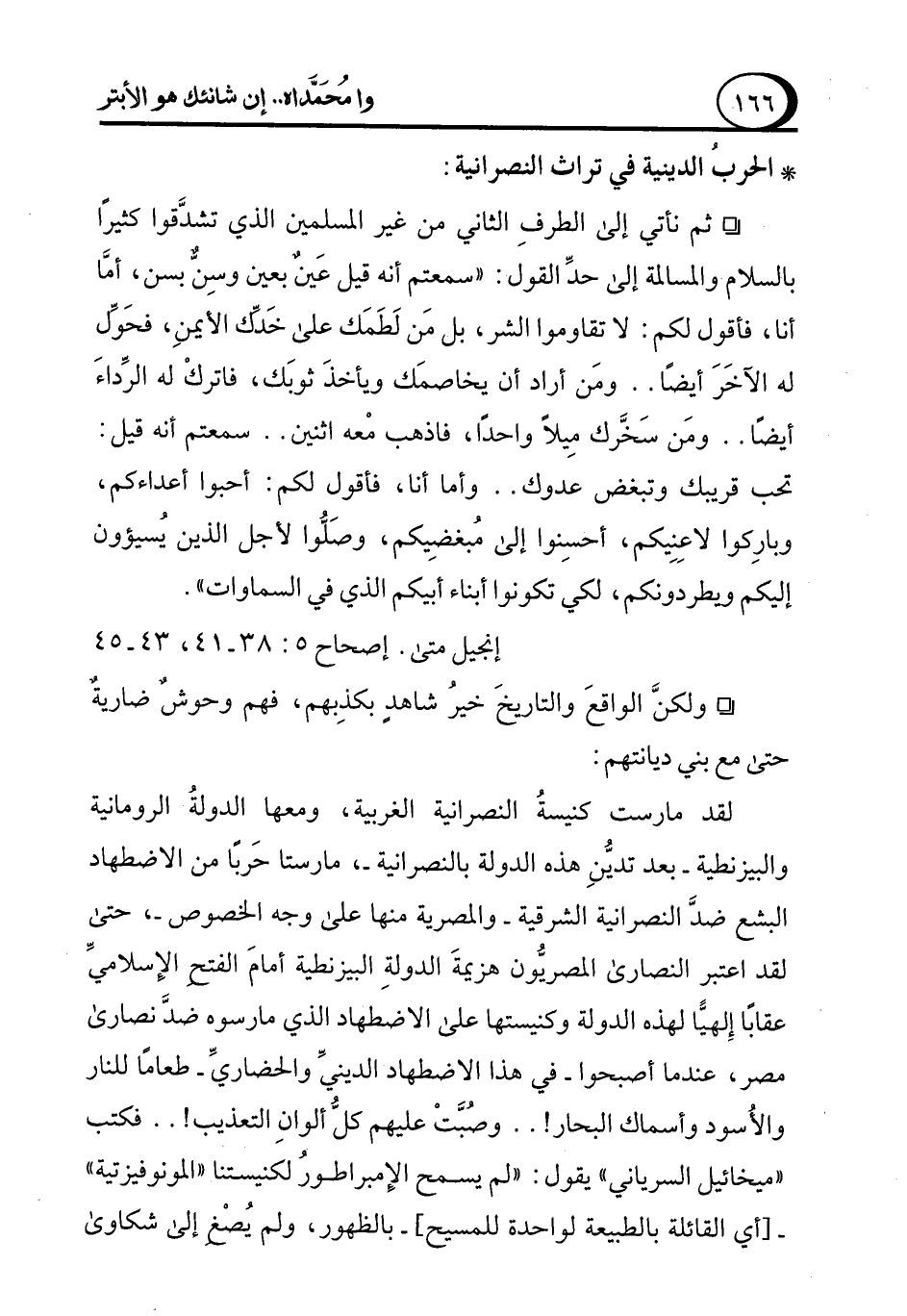 ° ثم نأتي إلى الطرفِ الثاني من غير المسلمين الذي تشدَّقوا كثيرًا بالسلام والمسالمة إلى حدِّ القول: "سمعتم أنه قيل عَينٌ بعين وسِنٌّ بسن، أمَّا أنا، فأقول لكم: لا تقاوموا الشر، بل مَن لَطَمَك على خَدك الأيمنِ، فحَوِّل له الآخَرَ أيضًا .. ومَن أراد أن يخاصمَك ويأخذَ ثوبَك، فاتركْ له الرِّداءَ أيضًا .. ومَن سَخَّرك مِيلاً واحدًا، فاذهب معه اثنين .. سمعتم أنه قيل: تحب قريبك وتبغض عدوك .. وأما أنا، فأقول لكم: أحبوا أعداءكم، وبارِكوا لاعِنِيكم، أحسِنوا إلى مُبغضِيكم، وصَلُّوا لأجل الذين يُسيؤون إليكم ويطردونكم، لكي تكونوا أبناء أبيكم الذي في السماوات".