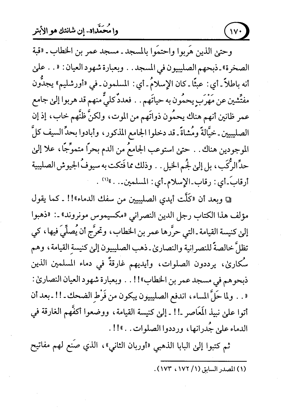 ° وبعد أن "كَلَّت أيدي الصليبيين من سفك الدماء"!! -كما يقول مؤلف هذا الكتاب رجل الدين النصراني "مكسيموس مونروند" -: "ذهبوا إلى كنيسة القيامة - التي حرَّرها عمر بن الخطاب، وتحرَّج أن يُصلِّيَ فيها، كي تظلَّ خالصةً للنصرانية والنصارى - ذهب الصليبيون إلى كنيسةِ القيامة، وهم سُكارى، يرددون الصلوات، وأيديهم غارقةٌ في دماء المسلمين الذين ذبحوهم في مسجد عمر بن الخطاب"!! .. وبعبارة شهود العيان النصارى: " .. ولما حَلَّ المساء، اندفع الصليبيون يبكون من فَرْطِ الضحك-!! - بعد أن أتوا على نبيذ المَعَاصر-!! - إلى كنيسة القيامة، ووضعوا أكفَّهم الغارقة في الدماء على جُدرانها، ورددوا الصلوات .. "!!.