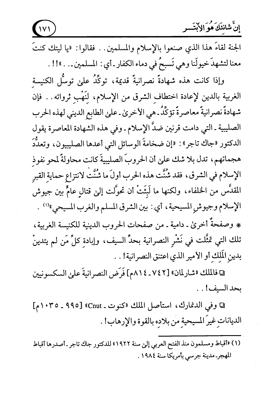 وإذا كانت هذه شهادةً نصرانيةً قديمة، توكِّدُ على توسُّل الكنيسةِ الغربية بالدين لإعادة اختطافِ الشرق من الإسلام، لِنَهْبِ ثرواته .. فإن شهادةً نصرانيةً معاصرةً تؤكِّدُ -هي الأخرى- على الطابع المديني لهذه الحرب الصليبية -التي دامت قرنين ضدَّ الإسلام- وفي هذه الشهادة المعاصرة يقول الدكتور "جاك تاجر": "إن ضخامةَ الوسائل التي أعدها الصليبيون، وتعدُّدَ هجماتهم، تدل بلا شك على أن الحروبَ الصليبيةَ كانتا محاولةً لمحو نفوذِ الإسلام في الشرق، فقد شُنَّت هذه الحرب أولَ ما شُنَت لانتزاع حمايةِ القبرِ المقدَّس من الخلفاء، ولكنها ما لَبِثَتْ أن تحوَّلت إلى قتالٍ عامٍّ بين جيوش الإسلام وجيوشِ المسيحية، أي: بين الشرق المسلم والغرب المسيحي" (¬1).