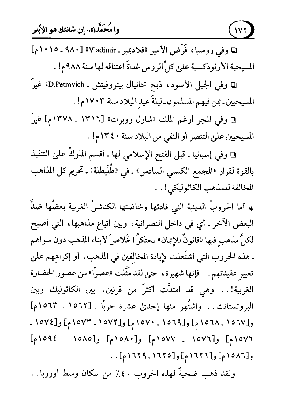 * أما الحروبُ الدينية التي قادتها وخاضتها الكنائسن الغربية بعضها ضدَّ البعض الآخر -أي في داخل النصرانية، وبين أتباع مذاهبها، التي أصبح لكلِّ مذهبٍ فيها "قانون للإيمان" يحتكرُ الخَلاصَ لأبناء المذهب دون سواهم - هذه الحروب التي اشتَعلت لإبادة المخالِفين في المذهب، أو إكراهِهم على تغييرِ عقيدتهم .. فإنها شهيرة، حتى لقد مَثلت "عصرًا" من عصور الحضارة الغربية! .. وهي قد امتدَّت أكثرَ من قرنين، بين الكاثوليك وبين البروتستانت .. واشتُهر منها إحدى عشرة حربًا-[1562 - 1563 م] و [1567 - 1568م] و [1569 - 1570م] و [1572 - م1573] و [1574 - 1576م] و [1576 - 1577م] و [1580م] و [1585 - 1594م] و [1586م] و [1621م] و [1625 - 1629م] .... ولقد ذهب ضحية لهذه الحروب 40% من سكان وسط أوروبا ..