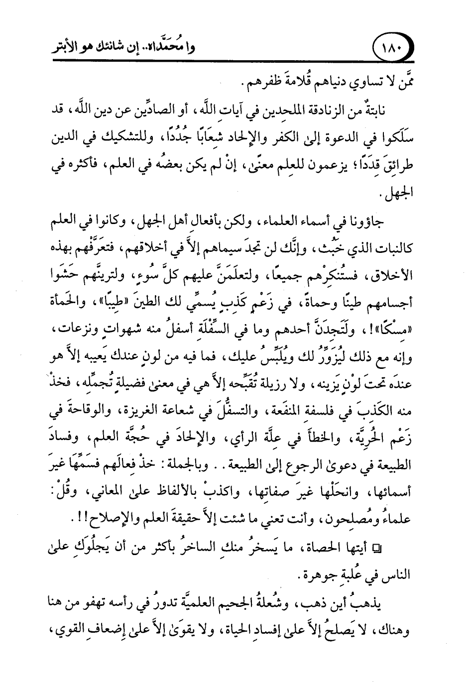 جاؤونا في أسماء العلماء، ولكن بأفعالِ أهل الجهل، وكانوا في العلم كالنبات الذي خَبُث، وإنَّك لن تجدَ سيماهم إلاَّ في أخلاقهم، فتعَرَّفهم بهذه الأخلاق، فستُنكِرْهم جميعًا، ولتعلَمَنَّ عليهم كل سُوءٍ، ولترينَهم حَشَوا أجسامهم طينًا وحماةً، في زَعْم كَذِبٍ يُسمي لك الطينَ "طِيبًا"، والحَمأة "مِسْكًا"!، ولَتَجِدَنَّ أحدهم وما في السِّفْلَةِ أسفلُ منه شهواتٍ ونزعات، وإنه مع ذلك ليُزَوَّرُ لك ويُلَبِّسُ عليك، فما فيه من لونٍ عندك يَعيبه إلاَّ هو عندَه تحتَ لوْنٍ يَزينه، ولا رزيلة تُقبِّحه إلاَّ هي في معنى فضيلةٍ تجملِه، فخذْ منه الكَذِبَ في فلسفةِ المنفَعة، والتسفُّلَ في شعاعة الغريزة، والوقاحةَ في زَعْم الحُرِيَّة، والخطأَ في عِلَّة الرأي، والإلحادَ في حُجَّة العلم، وفسادَ الطبيعة في دعوى الرجوع إلى الطبيعة .. وبالجملة: خذْ فِعالَهم فسَمِّهَا غيرَ أسمائها، وانحَلْها غيرَ صفاتِها، واكذبْ بالألفاظ على المعاني، وقُلْ: علماءُ ومُصلِحون، وأنت تعني ما شئت إلاَّ حقيقةَ العلم والإصلاح!!.