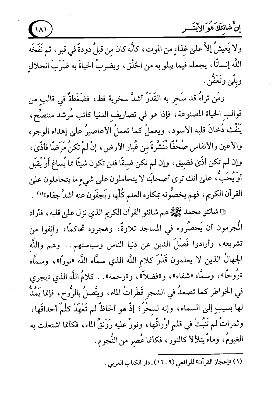 ° شانئو محمد - صلى الله عليه وسلم - هم شانئو القرآن الكريم الذي نزل على قلبه، فأراد المُجرمون أن يَحصُروه في المساجد تلاوةً، وهجروه تحاكمًا، وأنِفوا من تشريعه، وأرادوا فَصْلَ الدين عن دنيا الناس وسياستهم .. وهم واللهِ الجهالُ الذين لا يعلمون قَدْرَ كلام الله الذي سمَّاه الله "نورًا"، وسمَّاه "رُوحًا"، وسمَّاه "شفاء"، و"فضلاً"، و"رحمة" .. كلامُ الله الذي "يجري في الخواطر كما تصعدُ في الشجرِ قَطَراتُ الماء، ويتَصل بالرُّوح، فإنما يَمدُّ لها بسببٍ إلى السماء، وإنه لسِحْر؛ إذْ هو ألحاظٌ لم تَعْهَدْ كلْم أحداقَها، وثمراتٌ لم تَنبُتْ في قلم أوْراقُها، ونورٌ عليه رَوْنقُ الماء، فكأنما اشتعلت به الغيومُ، وماء يتلألأ كالنور، فكأنما عُصِر من النُّجوم.