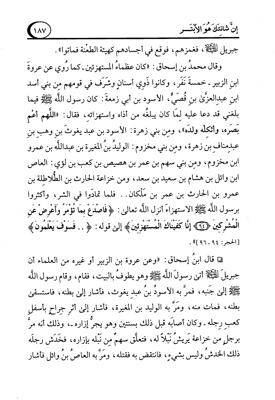 ° قال ابنُ إسحاق: "وعن عروة بن الزبير أو غيره من العلماء أن جبريلَ عليه السلام أتى رسولَ الله - صلى الله عليه وسلم - وهو يطوفُ بالبيت، فقام، وقام رسول الله - صلى الله عليه وسلم - إلى جَنبه، فمرَّ به الأسودُ بنُ عبدِ يغوث، فأشار إلى بطنه، فاستسقى بطنه، فمات منه، ومَرَّ به الوليد بن المغيرة، فأشار إلى أثرِ جِراح بأسفل كعبِ رِجله -وكان أصابَه قبل ذلك بسنتين وهو يجرُّ إزاره -، وذلك أنه مرَّ برجل من خزاعة يَريشُ نَبْلاً له، فتعلَّق سهم مِن نَبْله بإزاره، فخَدَش رجلَه ذلك الخدشُ وليس بشيء، فانتقض به فقتله، ومَرَّ به العاصُ بنُ وائل فأشار