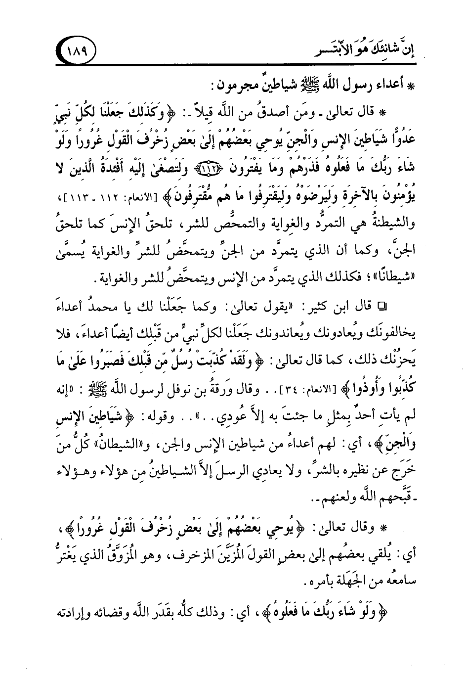 ° قال ابن كثير: "يقول تعالى: وكما جَعَلْنا لك يا محمدُ أعداءَ يخالفونَك ويعادونك وُيعاندونك جَعَلْنا لكلِّ نبيٍّ من قَبْلِك أيضًا أعداءَ، فلا يَحزنك ذلك، كما قال تعالى: {وَلَقَدْ كُذِّبَتْ رُسُلٌ مِنْ قَبْلِكَ فَصَبَرُوا عَلَى مَا كُذِّبُوا وَأُوذُوا} [الأنعام: 34] .. وقال وَرقةَ بن نوفل لرسول الله - صلى الله عليه وسلم -: "إنه لم يأتِ أحدٌ بِمثل ما جئتَ به إلاَّ عودِي .. " .. وقوله: {شَيَاطينَ الإِنسِ وَالْجِنِّ}، أي: لهم أعداء من شياطين الإنس والجن، و"الشيطان" كلُّ منَ خَرَج عن نظيره بالشرِّ، ولا يعادِي الرسلَ إلاَّ الشياطين مِن هؤلاء وهؤلاء -قَبَّحهم الله ولعنهم-.