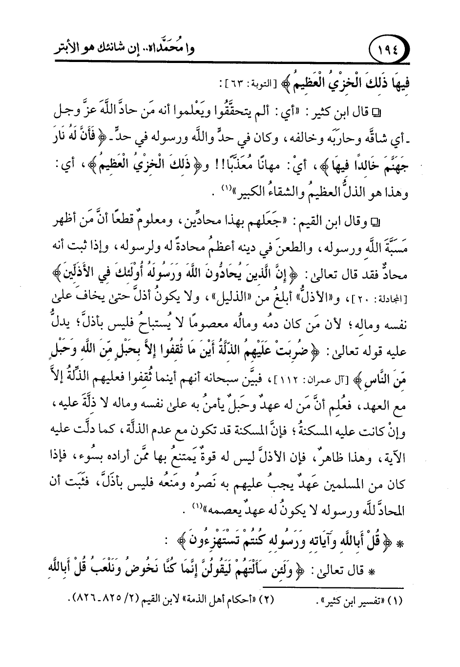 ° وقال ابن القيم: "جَعَلهم بهذا محادِّين، ومعلوم قطعًا أنَّ مَن أظهر مَسَبَّةَ اللهِ ورسوله، والطعنَ في دينه أعظمُ محادةً له ولرسوله، وإذا ثبت أنه محادٌّ فقد قال تعالى: {إِنَّ الَّذينَ يُحَادُّونَ اللهَ وَرَسُولَهُ أُوْلَئِكَ فِي الأَذَلِّينَ} [المجادلة:20]، و"الأذلُّ" أبلغُ منَ "الذليل"، ولا يكونُ أذلَّ حتى يخافَ على نفسه ومالِه؛ لأن مَن كان دمُه ومالُه معصومًا لا يُستباحُ فليس بأذلَّ؛ يدلُّ عليه قوله تعالى: {ضُرِبَتْ عَلَيْهِمُ الذِّلَّةُ أَيْنَ مَا ثُقِفُوا إِلاَّ بِحَبْلٍ مِّنَ اللهِ وَحَبْلٍ مِّنَ النَّاس} [آل عمران: 112]، فبيَّن سبحانه أنهم أينما ثُقِفوا فعليهم الذِّلةُ إلاَّ مع العهد، فعُلِم أنَّ مَن له عهد وحَبل يأمنُ به على نفسه وماله لا ذِلَّةَ عليه، وإنْ كانت عليه المسكنةُ؛ فإنَّ المسكنة قد تكون مع عدم الذلَّة، كما دلَّت عليه الآية، وهذا ظاهرٌ، فإن الأذلَّ ليس له قوةٌ يَمتنعُ بها ممَّن أراده بسُوء، فإذا كان من المسلمين عَهدٌ يجبُ عليهم به نَصرُه ومنعُه فليس بأذَلَّ، فثَبَت أن المحادَّ لله ورسوله لا يكونُ له عهدٌ يعصمه" (¬2).