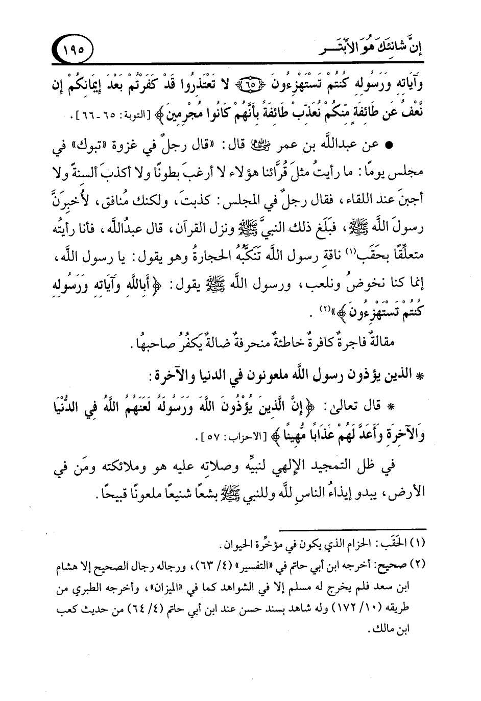 • عن عبد الله بن عمر- رضي الله عنه- قال: "قال رجل في غزوة "تبوك" في مجلس يومًا: ما رأيتُ مثلَ قُرَّائنا هؤلاء لا أرغبَ بطونًا ولا أكذبَ ألسِنةً ولا أجبنَ عند اللقاء، فقال رجلٌ في المجلس: كذبتَ، ولكنك مُنافق، لأُخبِرَنَّ رسولَ الله - صلى الله عليه وسلم - فبَلَغ ذلك- النبيَّ - صلى الله عليه وسلم - ونزل القرآن، قال عبدُ الله، فأنا رأيتُه متعلِّقًا بحَقَب (¬1) ناقةِ رسول الله تَنَكبهُ الحجارةُ وهو يقول: يا رسول الله، إنما كنا نخوضُ ونلعب، ورسول الله - صلى الله عليه وسلم - يقول: {أَبالله وَآيَاته وَرَسُوله كُنتُمْ تَسْتَهْزِءُونَ} " (¬2).