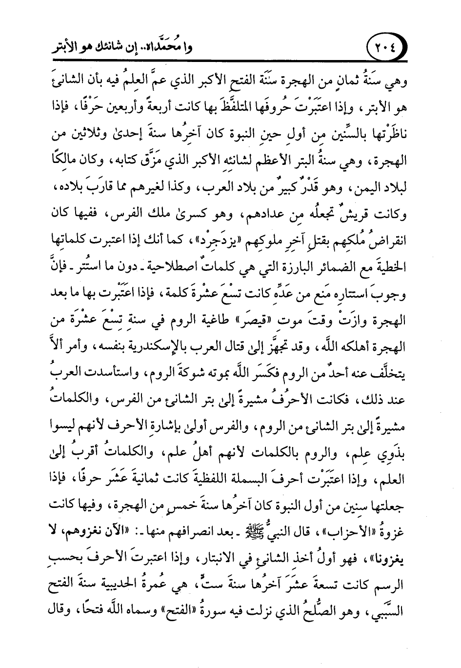 وهي سَنة ثمانِ من الهجرة سَنَة الفتح الأكبر الذي عمَّ العِلمُ فيه بأن الشانئَ هو الأبتر، وإذا اعتَبَرْتَ خروفَها المتلفَّظَ بها كانت أربعةَ وأربعين حَرْفًا، فإذا ناظَرْتها بالسِّنين مِن أولِ حينِ النبوة كان آخِرها سنةَ إحدى وثلاثين من الهجرة، وهي سنة البتر الأعظم لشانئِهِ الأكبر الذي مَزَّق كتابه، وكان مالِكًا لبلاد اليمن، وهو قَدْرٌ كبيرٌ من بلاد العرب، وكذا لغيرهم مما قارَبَ بلاده، وكانت قريشٌ تجعلُه مِن عدادهم، وهو كسرى ملك الفرس، ففيها كان انقراضُ فلكِهم بقتل آخِرِ ملوكِهم "يزدَجِرْد"، كما أنك إذا اعتبرت كلماتِها الخطيةَ مع الضمائر البارزة التي هي كلماتٌ اصطلاحية -دون ما استُتر- فإنَّ وجوبَ استتارِه مَنع من عَدِّهِ كانت تسْعَ عشْرةَ كلمة، فإذا اعَتَبْرت بها ما بعد الهجرة وازَتْ وقتَ موتِ "قيصَر" طاغية الروم في سنةِ تِسْعَ عشْرَة من الهجرة أهلكه الله، وقد تجهَّز إلى قتال العرب بالإسكندرية بنفسه، وأمر ألاَّ يتخلَّف عنه أحدٌ من الروم فكَسَر الله بموته شوكةَ الروم، واستأسدت العربُ عند ذلك، فكانت الأحرُفُ مشيرة إلى بتر الشانئ من الفرس، والكلماتُ مشيرةً إلى بتر الشانئ من الروم، والفرس أولى بإشارةِ الأحرف لأنهم ليسوا بذَوِي عِلم، والروم بالكلمات لأنهم أهلُ علم، والكلماتُ أقربُ إلى العلم، وإذا اعتَبَرْت أحرفَ البسملة اللفظيةَ كانت ثمانيةَ عَشَر حرفًا، فإذا جعلتها سِنين من أول النبوة كان آخرُها سنةَ خمس من الهجرة، وفيها كانت غزوة "الأحزاب"، قال النبي - صلى الله عليه وسلم - بعد إنصرافهم منها-: "الآن نغزوهم، لا يغزونا"، فهو أولُ أخذِ الشانئِ في الانبتار، وإذا اعتبرتَ الأحرفَ بحسبِ الرسم كانت تسعةَ عشَرَ آخرُها سنةَ ستٍّ، هي عُمرةُ الحديبية سنةَ الفتح السّبَبي، وهو الصّلحُ الذي نزلت فيه سورةُ "الفتح" وسماه الله فتحًا، وقال