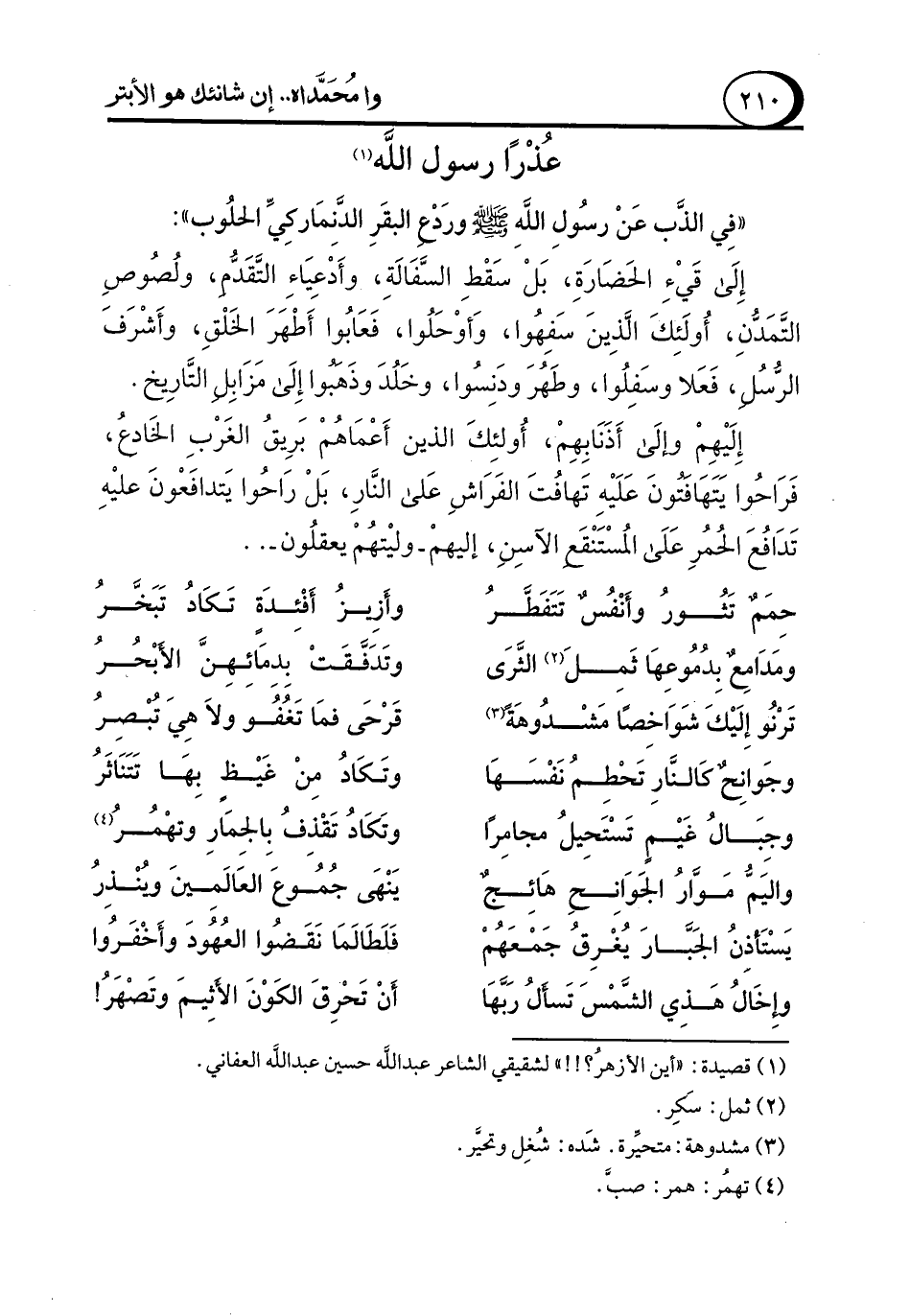 إِلَى قَيْءِ الحَضَارَةِ، بَلْ سَقْطِ السَّفَالَةِ، وأَدْعِيَاءِ التَقَدُّم، ولُصُوصِ التَمَدُّنِ، أُولَئِكَ الّذِينَ سَفِهُوا، وَأوْحَلُوا، فَعَابُوا أَطْهَرَ الخَلْقِ، وأَشْرَفَ الرسل، فَعَلا وسَفِلُوا، وطَهُرَ ودَنِسُوا، وخَلُدَ وذَهبوا إِلَى مَزَابِل التَّارِيخ.