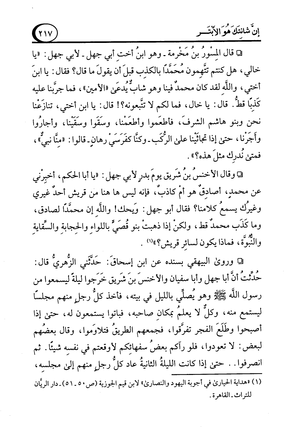 ° قال المِسْورُ بنُ مَخْرمة -وهو ابنُ أختِ أبي جهل- لأبي جهل: "يا خالي، هل كنتم تتَّهِمون مُحَمَّدًا بالكذِب قبلَ أن يقولَ ما قال؟ فقال: يا ابنَ أختي، واللهِ لقد كان محمدٌ فينا وهو شابٌّ يُدعَى "الأمين"، فما جرَّبنا عليه كَذِبًا قطُّ. قال: يا خال، فما لكم لا تتَّبعونه؟! قال: يا ابن أختي، تنازَعْنا نحن وبنو هاشم الشرفَ، فأطعَموا وأطعَمْنا، وسَقَوا وسَقَيْنا، وأجارُوا وأَجَرْنا، حتى إذا تجاثَيْنا على الرُّكَب -وكنَّا كفَرَسَيْ رهانٍ- قالوا: "مِنَّا نبيٌّ"، فمتى نُدرِك مثلَ هذه؟ ".