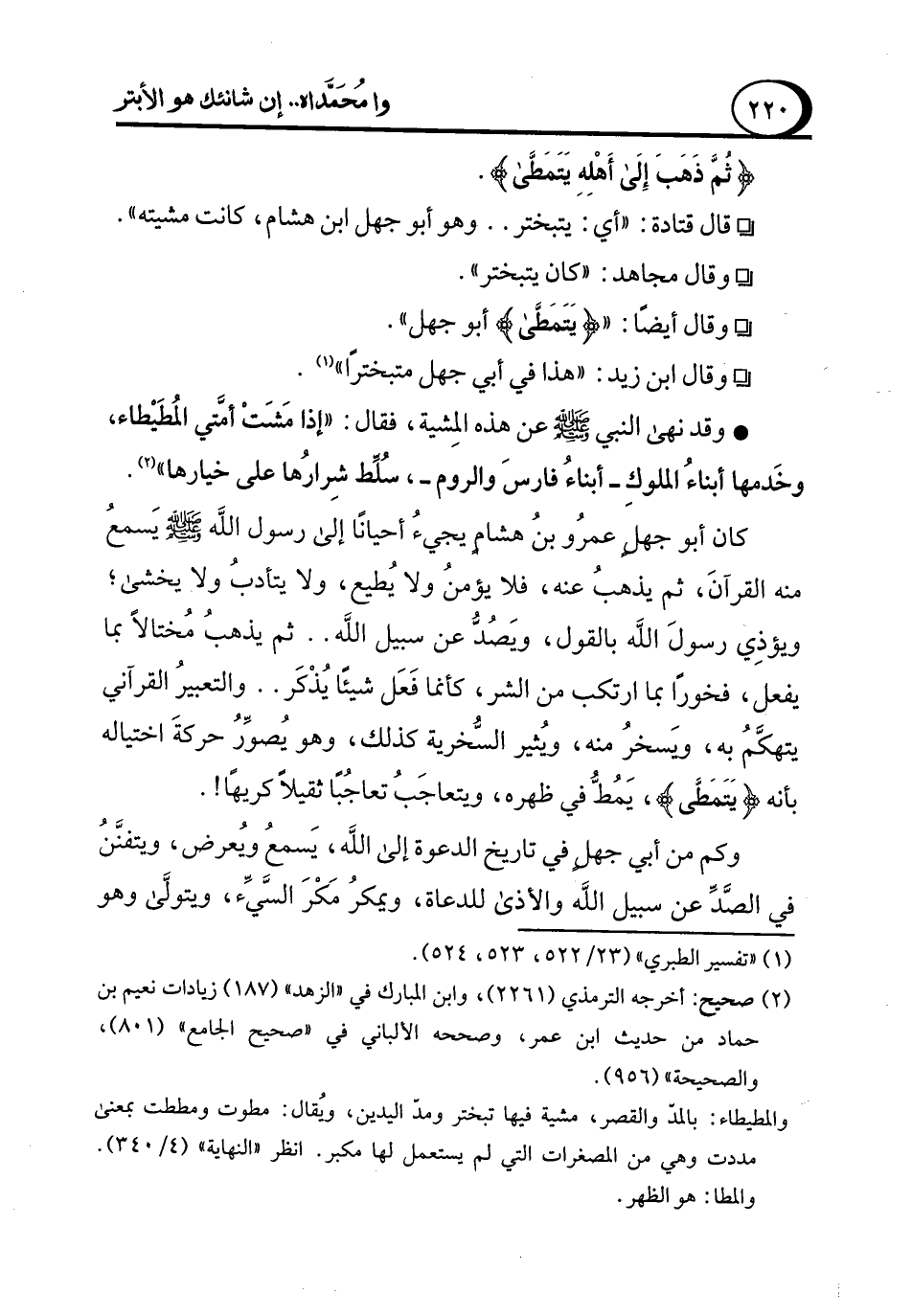 كان أبو جهلٍ عمرُو بنُ هشام يجيءُ أحيانًا إلى رسول الله - صلى الله عليه وسلم - يَسمعُ منه القرآنَ، ثم يذهبُ عنه، فلا يؤمنُ ولا يُطيع، ولا يتأدبُ ولا يخشى؛ ويؤذِي رسولَ الله بالقول، ويَصُدُّ عن سبيل الله .. ثم يذهبُ مُختالاً بما يفعل، فخورًا بما ارتكب من الشر، كأنما فَعَل شيئًا يُذْكَر .. والتعبيرُ القرآني يتهكَّمُ به، ويَسخرُ منه، ويُثير السُّخرية كذلك، وهو يُصوِّرُ حركةَ اختياله بأنه {يَتَمَطَّى}، يَمُطُّ في ظهره، ويتعاجَبُ تعاجُبًا ثقيلاً كريهًا!.