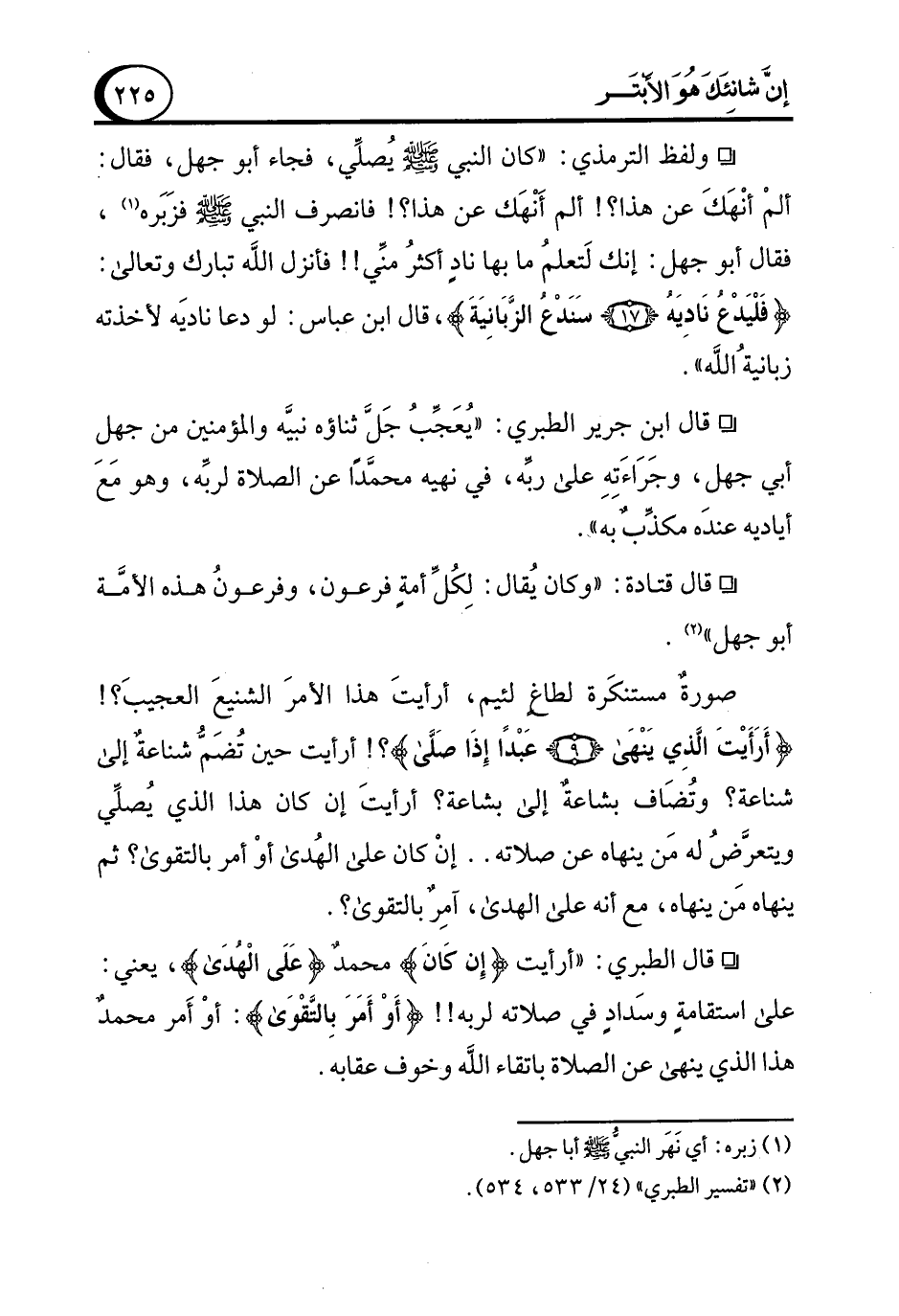 ° قال ابن جرير الطبري: "يُعَجِّبُ جَل ثناؤه نبيَّه والمؤمنين من جهل أبي جهل، وجَرَاءَتهِ على ربِّه، في نهيه محمَّدًا عن الصلاة لربِّه، وهو مَعَ أياديه عندَه مكذّبٌ بَه".