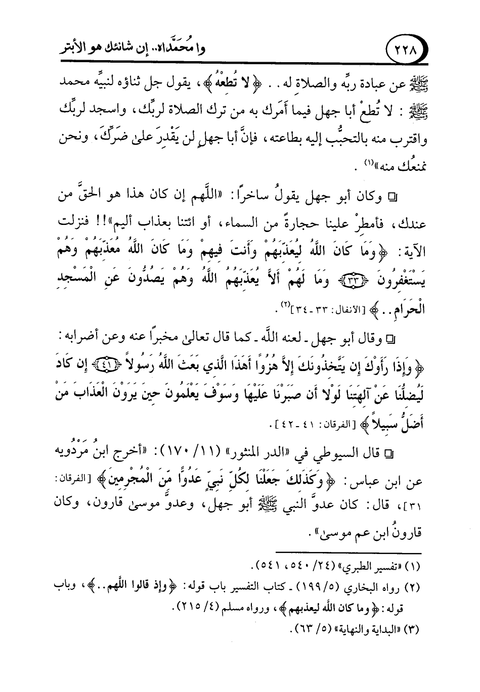 ° وقال أبو جهل -لعنه الله -كما قال تعالى مخبرًا عنه وعن أضرابه: {وَإِذَا رَأَوْكَ إِنْ يَتَّخِذُونَكَ إِلَّا هُزُوًا أَهَذَا الَّذِي بَعَثَ اللَّهُ رَسُولًا (41) إِنْ كَادَ لَيُضِلُّنَا عَنْ آلِهَتِنَا لَوْلَا أَنْ صَبَرْنَا عَلَيْهَا وَسَوْفَ يَعْلَمُونَ حِينَ يَرَوْنَ الْعَذَابَ مَنْ أَضَلُّ سَبِيلًا} [الفرقان: 41 - 42] (¬3).