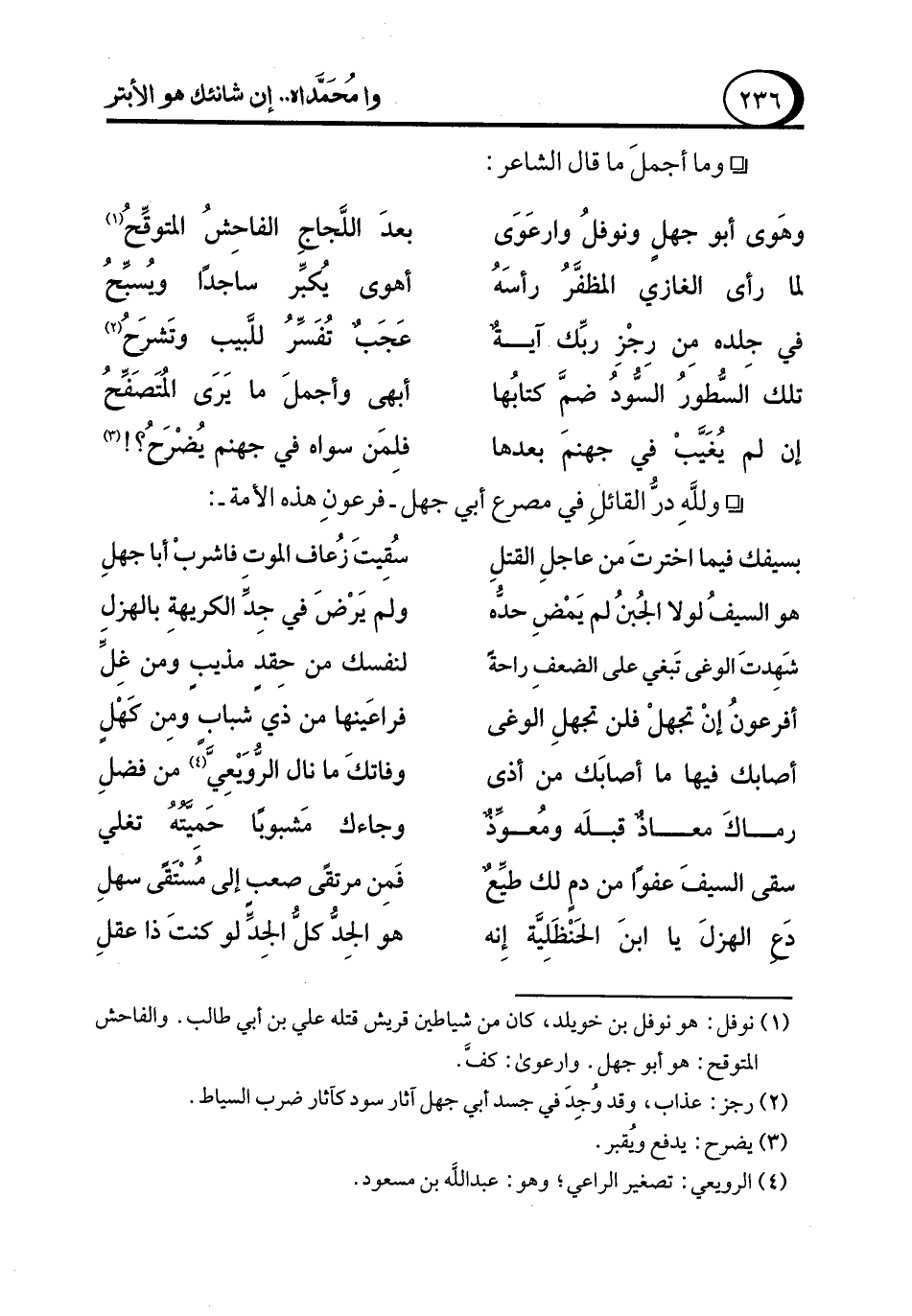 بسيفك فيما اخترتَ من عاجلِ القتلِ ... سُقِيتَ زُعاف الموت فاشربْ أبا جهلِ