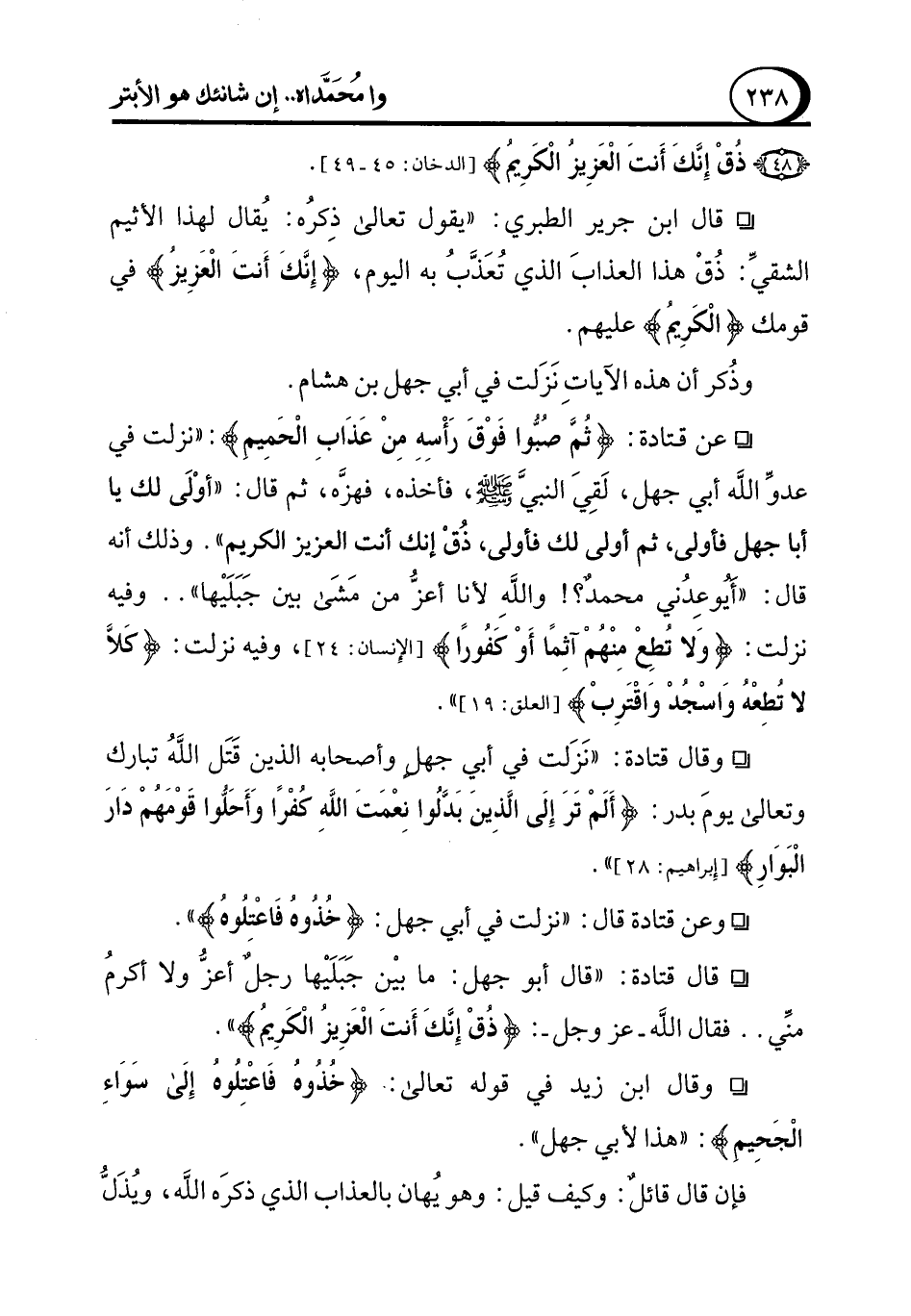 ° عن قتادة: {ثُمَّ صبُّوا فَوْقَ رَأْسِهِ مِنْ عَذَابِ الْحَمِيمِ}: "نزلت في عدوِّ الله أبي جهل، لَقِيَ النبيَّ - صلى الله عليه وسلم -، فأخذه، فهزَّه، ثم قال: "أوْلَى لك يا أبا جهل فأولى، ثم أولى لك فأولى، ذُقْ إنك أنت العزيز الكريم". وذلك أنه قال: "أيُوعِدُني محمدٌ؟! واللهِ لأنا أعزُّ من مَشَى بين جَبَلَيْها" .. وفيه نزلت: {وَلا تطِعْ مِنْهمْ آثِمًا أَوْ كَفُورًا} [الإِنسان: 24]، وفيه نزلت: {كَلاَّ لا تُطِعْة وَاسْجُدْ وَاقْتَرِبْ} [العلق: 19] ".