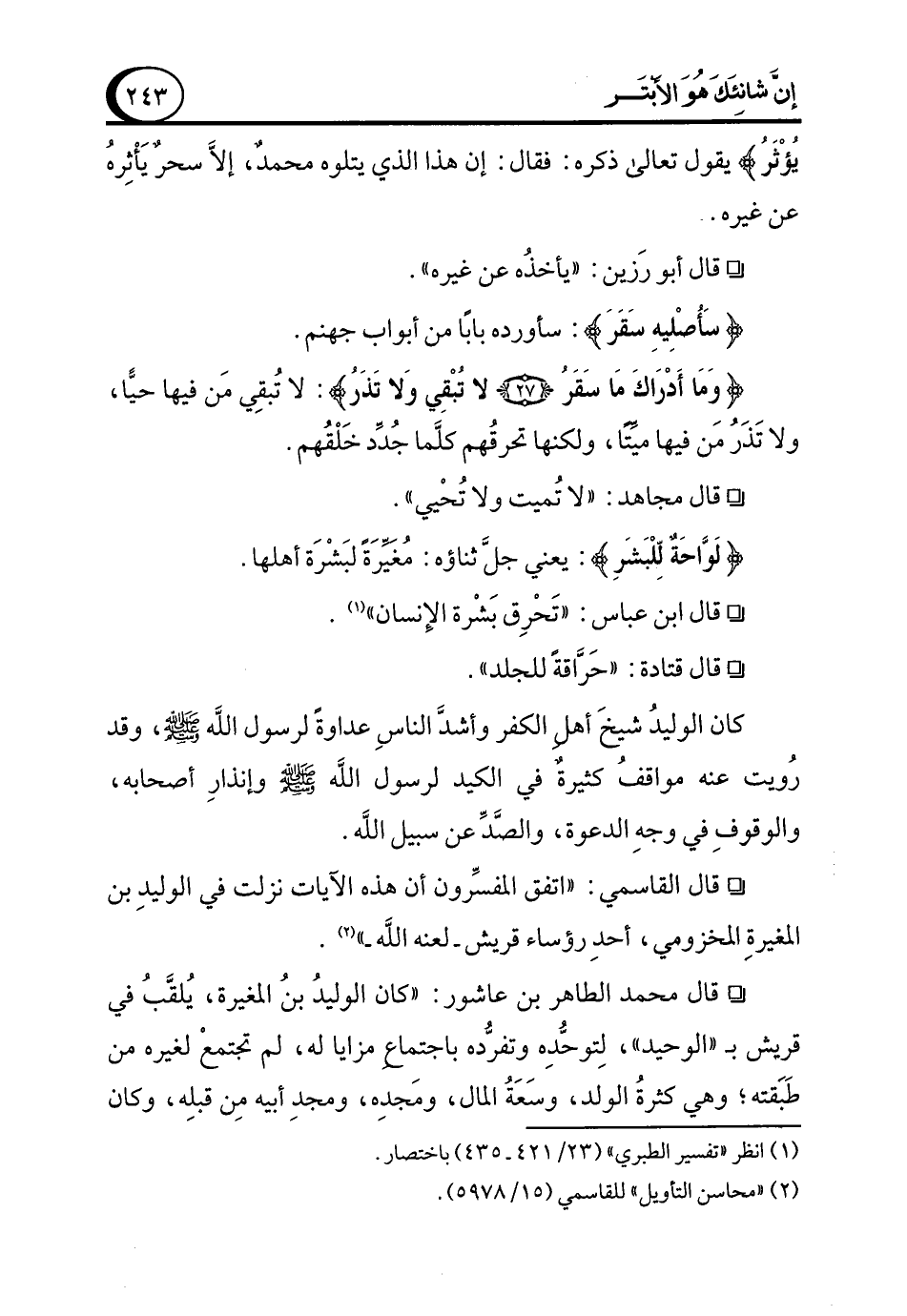 ° قال القاسمي: "اتفق المفسِّرون أن هذه الآيات نزلت في الوليدِ بن المغيرةِ المخزومي، أحدِ رؤساء قريش -لعنه الله-" (¬2).