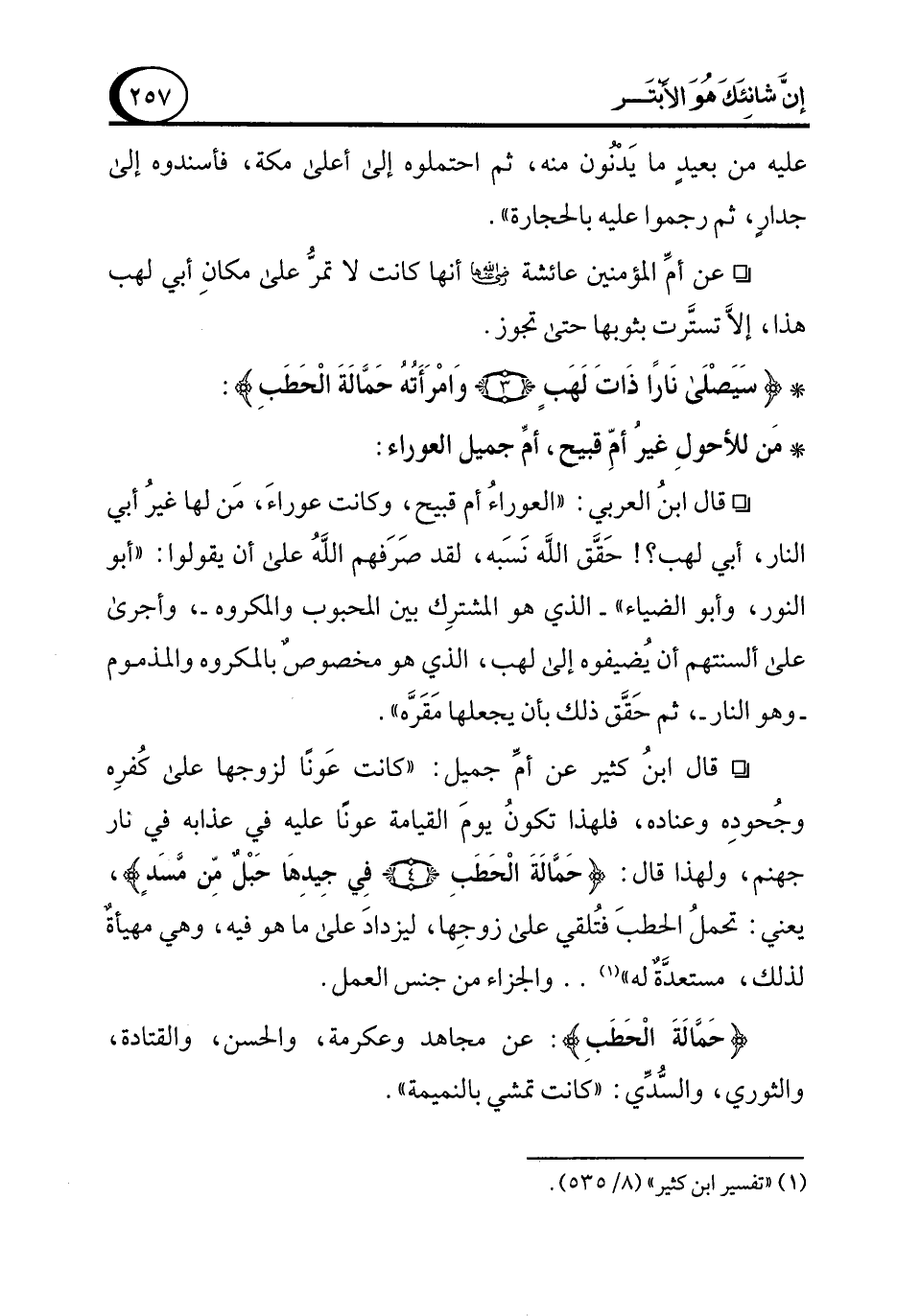 ° قال ابنُ العربي: "العوراءُ أم قبيح، وكانت عوراءَ، مَن لها غيرُ أبي النار، أبي لهب؟! حَقَّق الله نَسَبه، لقد صَرَفهم اللهُ على أن يقولوا: "أبو النور، وأبو الضياء" -الذي هو المشترِك بين المحبوب والمكروه-، وأجرى على ألسنتهم أن يُضيفوه إلى لهب، الذي هو مخصوصٌ بالمكروه والمذموم -وهو النار-، ثم حَقَّق ذلك بأن يجعلها مَقَرَّه".