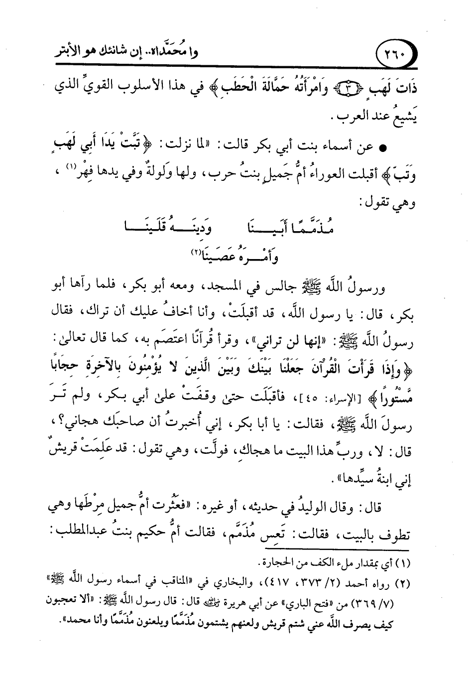 (¬2) رواه أحمد (2/ 373، 417)، والبخاري في "المناقب في أسماء رسول الله - صلى الله عليه وسلم -" (7/ 369) من "فتح الباري" عن أبي هريرة - رضي الله عنه - قال: قال رسول الله - صلى الله عليه وسلم -: "ألا تعجبون كيف يصرت الله عني شتم قريش ولعنهم يشتمون مُذَمَّمًا ويلعنون مُذَمَّمًا وأنا محمد".