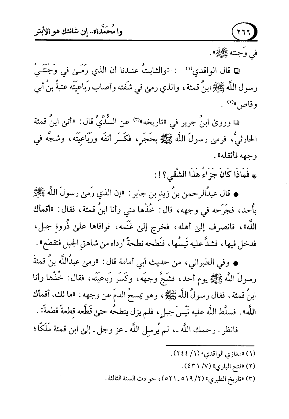 ° وروى ابنُ جرير في "تاريخه" (¬3) عن السُّدِّيِّ قال: "أتى ابنُ قمئة الحارثيُّ، فرمى رسولَ الله - صلى الله عليه وسلم - بحَجَر، فكَسَر أنفَه ورَبَاعِيَتَه، وشجَّه في وجهه فأثقله".