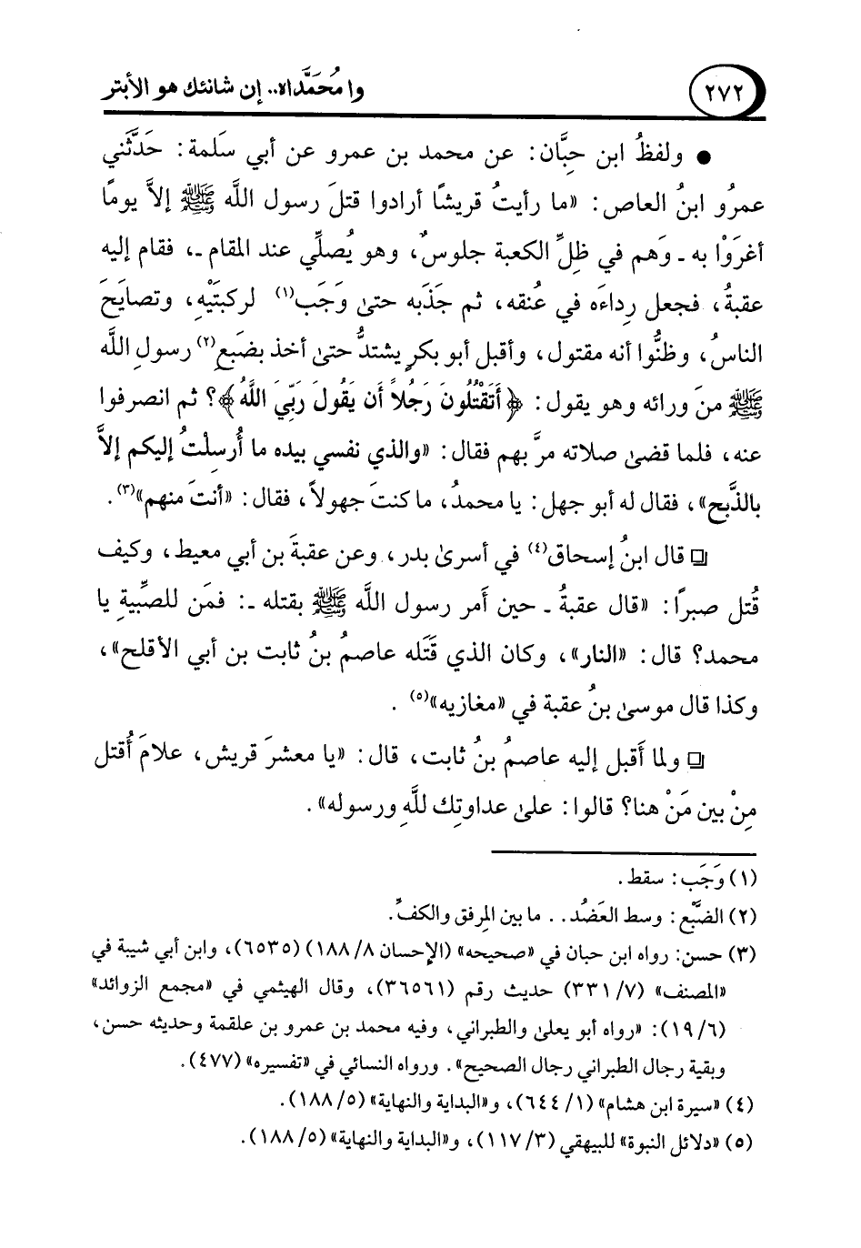 • ولفظُ ابن حِبَّان: عن محمد بن عمرو عن أبي سَلمة: حَدَّثَني عمرُو ابنُ العاص: "ما رأيتُ قريشًا أرادوا قتلَ رسول الله - صلى الله عليه وسلم - إلاَّ يومًا أغرَوا به -وَهم في ظِلِّ الكعبة جلوس، وهو يُصلِّي عند المقام-، فقام إليه عقبةُ، فجعل رِداءَه في عُنقه، ثم جَذَبه حتى وَجَب (¬1) لركبتَيْهِ، وتصايَحَ الناسُ، وظنُّوا أنه مقتول، وأقبل أبو بكرٍ يشتدُّ حتى أخذ بضَبغ (¬2) رسولِ الله - صلى الله عليه وسلم - منَ ورائه وهو يقول: {أَتَقْتُلُونَ رَجُلًا أَنْ يَقُولَ رَبِّيَ اللَّهُ}؟ ثم انصرفوا عنه، فلما قضى صلاته مرَّ بهم فقال: "والذي نفسي بيده ما أُرسلتُ إليكم إلاَّ بالذَّبح"، فقال له أبو جهل: يا محمدُ، ما كنتَ جهولاً، فقال: "أنَتَ منهم" (¬3).