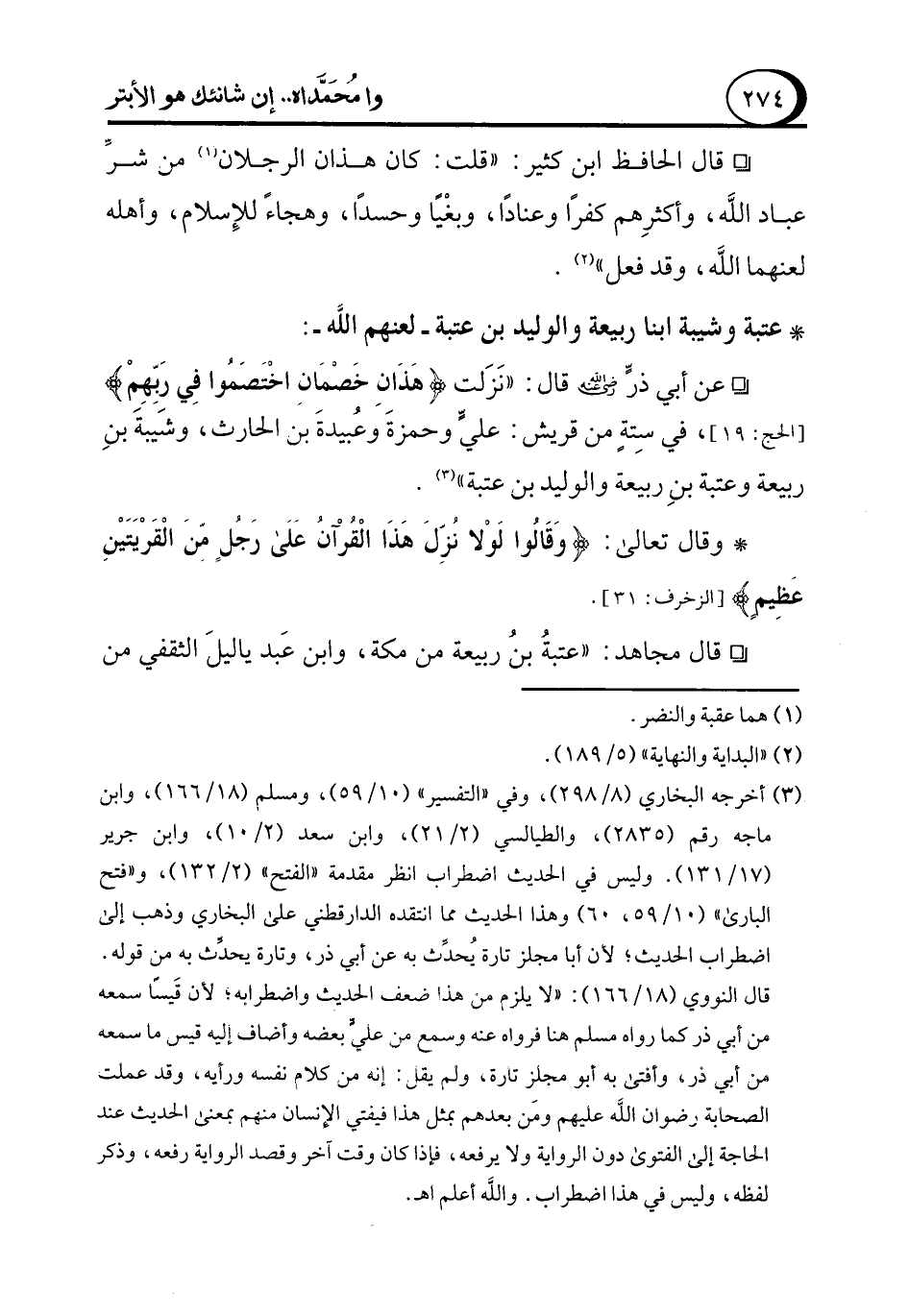 ° قال الحافظ ابن كثير: "قلت: كان هذان الرجلان (¬1) من شرِّ عباد الله، وأكثرِهم كفرًا وعنادًا، وبغْيًا وحسدًا، وهجاءً للإِسلام، وأهله لعنهما الله، وقد فعل" (¬2).