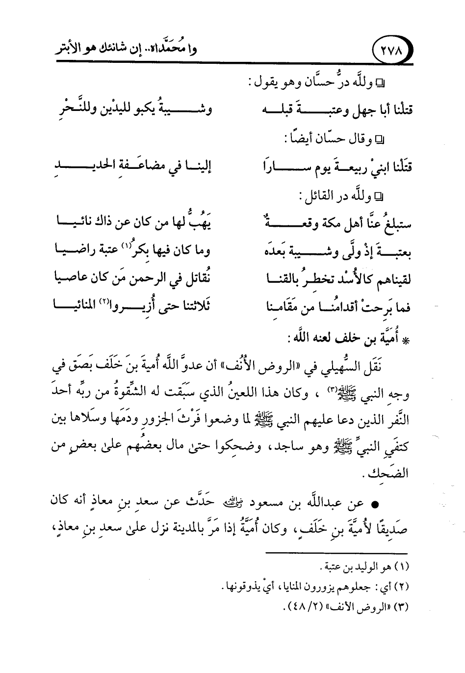 نَقَل السُّهيلي في "الروض الأُنُف" أن عدوَّ الله أُميةَ بنَ خَلَف بَصَق في وجهِ النبي - صلى الله عليه وسلم - (¬3)، وكان هذا اللعينُ الذي سَبَقت له الشِّقوةُ من ربِّه أحدَ النَّفر الذين دعا عليهم النبي- صلى الله عليه وسلم - لما وضعوا فَرْثَ الجزورِ ودَمَها وسَلاها بين كتفَيِ النبيِّ - صلى الله عليه وسلم - وهو ساجد، وضحِكوا حتى مال بعضُهم على بعضٍ من الضَحك.