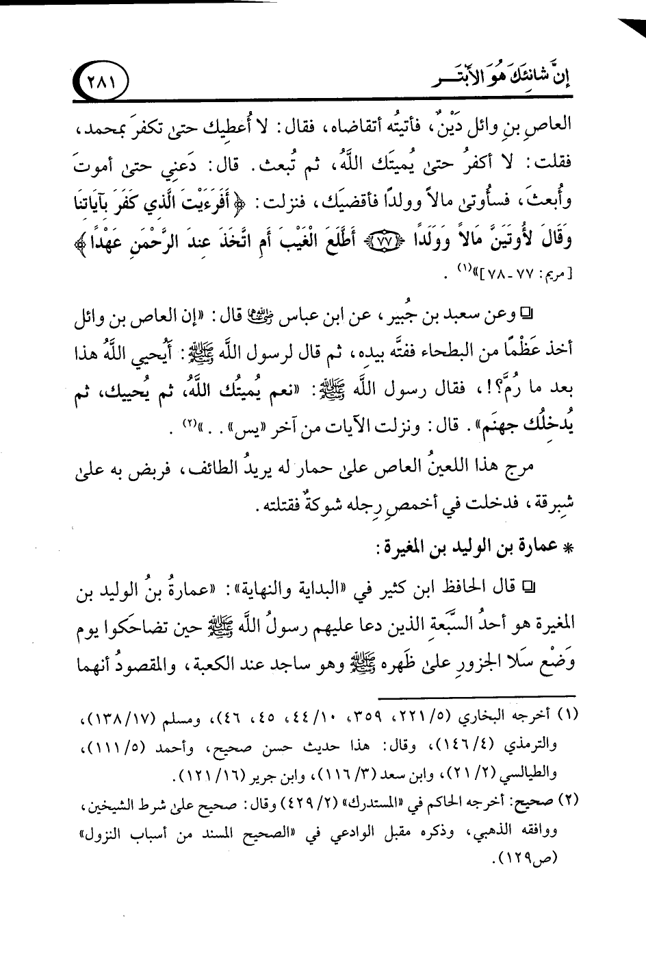 ° وعن سعبد بن جُبير، عن ابن عباس - صلى الله عليه وسلم - قال: "إن العاص بن وائل أخذ عَظْمًا من البطحاء ففتَّه بيدِه، ثم قال لرسول الله - صلى الله عليه وسلم -: أيُحيي اللهُ هذا بعد ما رُمَّ؟!، فقال رسول الله - صلى الله عليه وسلم -: "نعم يُميتُك اللهُ، ثم يُحييك، ثم يُدخِلُك جهنَم". قال: ونزلت الآيات من آخر "يس" .. " (¬2).