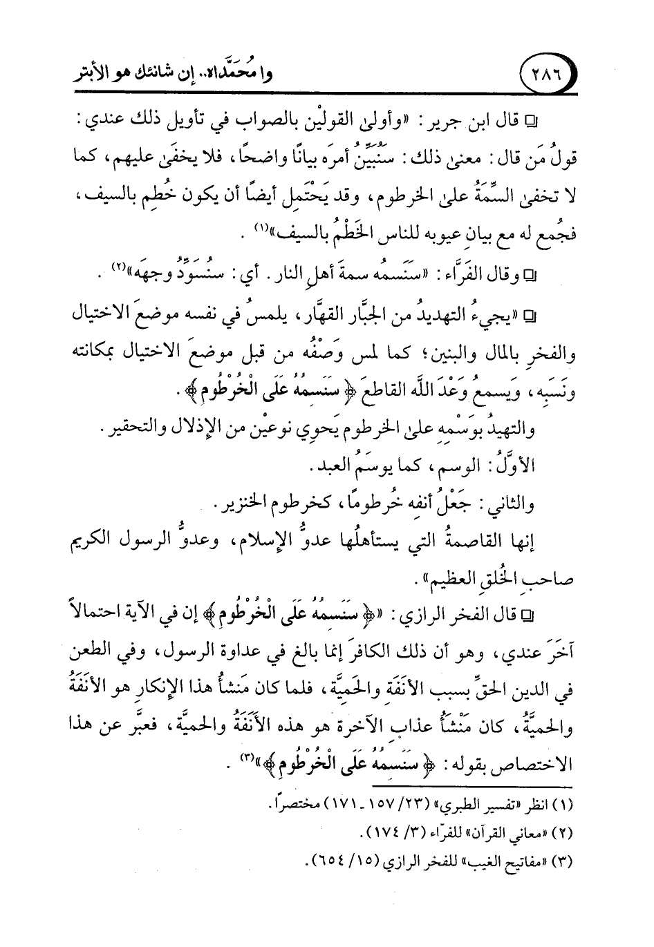 ° قال ابن جرير: "وأولى القوليْن بالصواب في تأويل ذلك عندي: قولُ مَن قال: معنى ذلك: سنبينُ أمرَه بيانًا واضحًا، فلا يخفَى عليهم، كما لا تخفى السِّمَةُ على الخرطوم، وقد يَحْتَمِل أيضًا أن يكون خُطِم بالسيف، فجُمع له مع بيانِ عيوبه للناس الخَطْمُ بالسيف" (¬1).