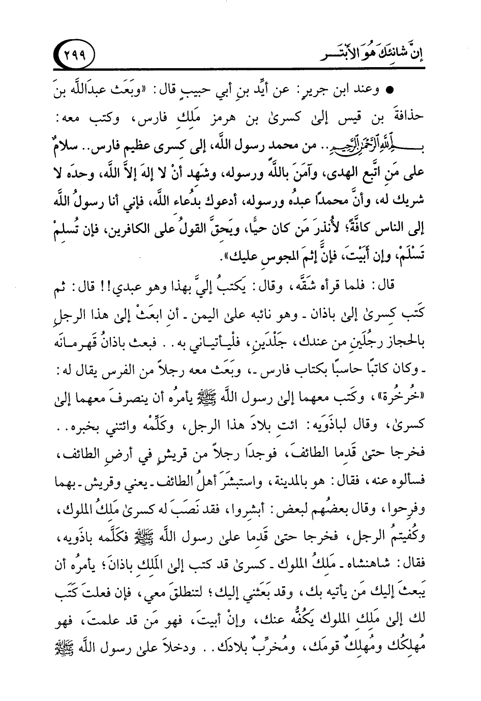 • وعند ابن جريرٍ: عن أيِّد بنِ أبي حبيبٍ قال: "وبَعَث عبدَ الله بنَ حذافةَ بن قيس إلى كسرى بن هرمز مَلِكِ فارس، وكتب معه: بسم الله الرحمن الرحيم .. من محمد رسول الله، إلى كسرى عظيم فارس .. سلامٌ على مَنِ اتَبع الهدى، وآمَنَ باللهً ورسوله، وشَهِد أَنْ لا إلهَ إلاَّ الله، وحدَه لا شريك له، وأنَ محمدًا عبدُه ورسوله، أدعوك بدُعاء الله، فإني أنا رسولُ الله إلى الناس كافَّةً؛ لأُنذرَ مَن كان حيًّا، ويَحِقَّ القولُ عَلى الكافرين، فإن تُسلمْ تَسْلَمْ، وإن أبَيْتَ، فإنَّ إثمَ المجوسِ عليك".