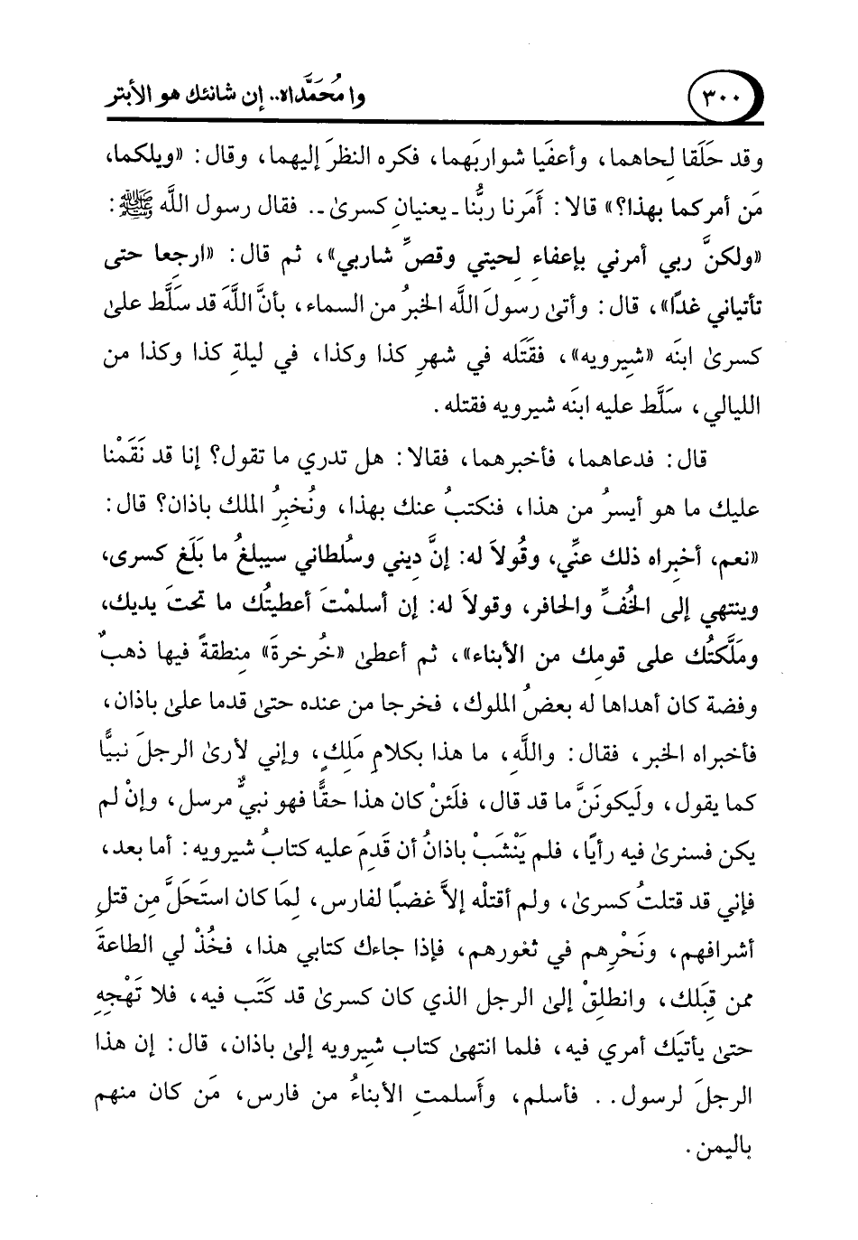 قال: فدعاهما، فأخبرهما، فقالا: هل تدري ما تقول؟ إنا قد نَقَمْنا عليك ما هو أيسرُ من هذا، فنكتبُ عنك بهذا، ونخبِر الملك باذان؟ قال: "نعم، أخبِراه ذلك عنِّي، وقُولاَ له: إن دِيني وسُلطاني سيبلغُ ما بَلَغ كسرى، وينتهي إلى الخُفِّ والحافر، وقولاَ له: إن أسلمْتَ أعطيتُك ما تحتَ يديك، ومَلَّكتُك على قومك من الأبناء"، ثم أعطى "خُرخرةَ" مِنطقةً فيها ذهبٌ وفضة كان أهداهاَ له بعضُ الملوك، فخرجا من عنده حتى قدما على باذان، فأخبراه الخبر، فقال: واللهِ، ما هذا بكلامِ مَلِلكٍ، وإني لأرى الرجلَ نبيًّا كما يقول، ولَيكونَنَّ ما قد قال، فلَئنْ كان هذا حقًّا فهو نبيُّ مرسل، وإنْ لم يكن فسنرى فيه رأيًا، فلم يَنْشَبْ باذانُ أن قَدِمَ عليه كتابُ شيرويه: أما بعد، فإني قد قتلتُ كسرى، ولم أقتلْه إلاَّ غضبًا لفارس، لِمَا كان استَحَل مِن قتل أشرافهم، ونَحْرِهم في ثغورهم، فإذا جاءك كتابي هذا، فخُذْ لي الطاعةَ ممن قبِلك، وانطلِقْ إلى الرجل الذي كان كسرى قد كَتَب فيه، فلا تَهْجِهِ حتى يأتيَك أمري فيه، فلما انتهى كتاب شِيرويه إلى باذان، قال: إن هذا الرجلَ لرسول .. فأسلم، وأَسلمتِ الأبناءُ من فارس، مَن كان منهم باليمن.