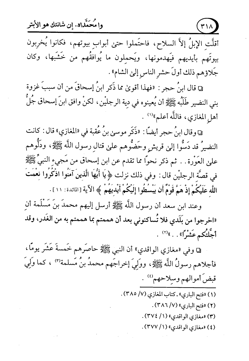 ° قال ابنُ حجر: "فهذا أقوى مما ذَكر ابنُ إسحاقَ من أن سببَ غزوة بنى النضير طَلَبُه - صلى الله عليه وسلم - أن يُعينوه في دِية الرجليْن، لكنْ وافق ابنَ إسحاق جُلُّ أهل المغازي، فالله أعلم" (¬1).