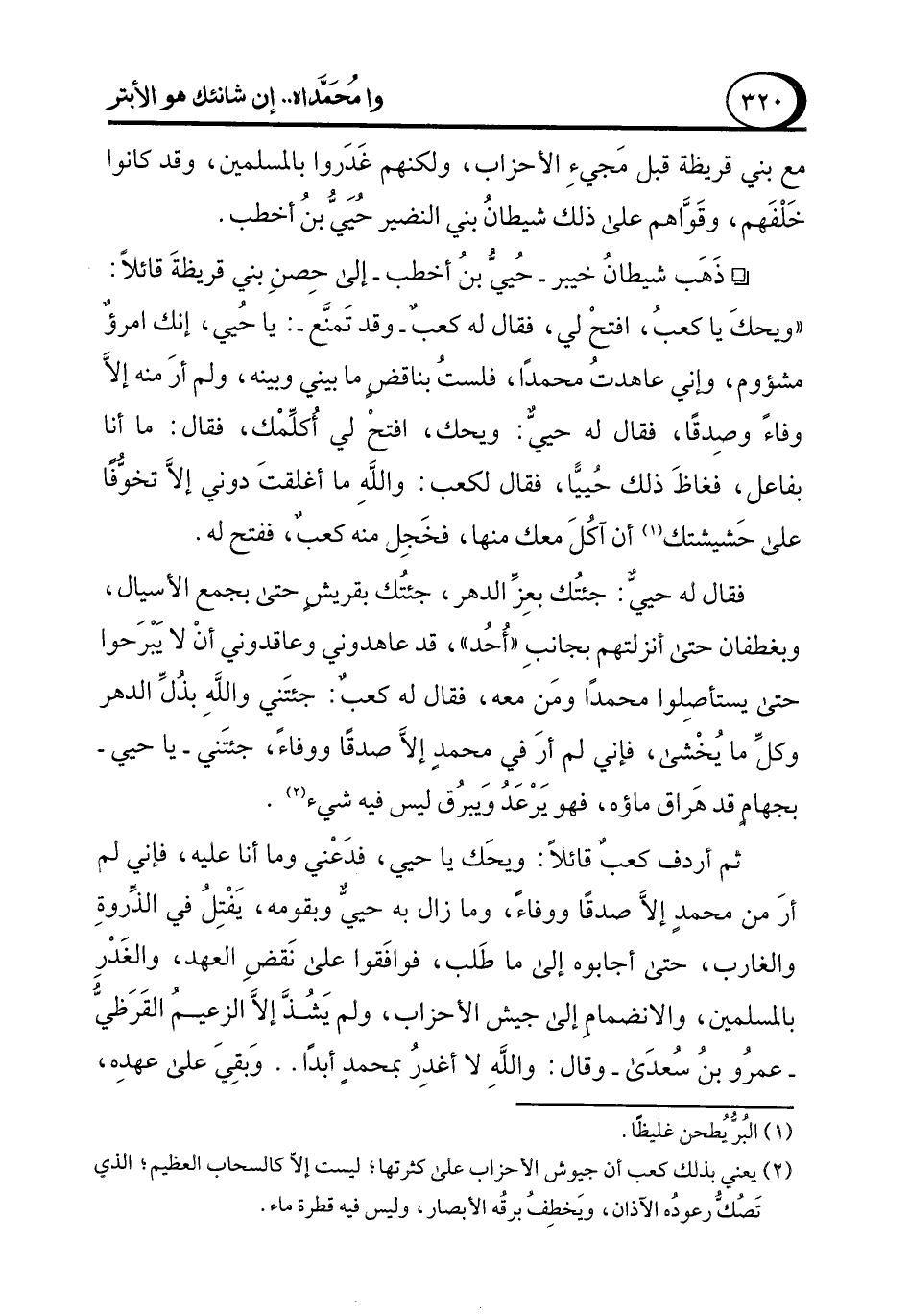مع بني قريظة قبل مَجيءِ الأحزاب، ولكنهم غَدَروا بالمسلمين، وقد كانوا خَلْفَهم، وقَوَّاهم على ذلك شيطانُ بني النضير حُيَيّ بنُ أخطب.