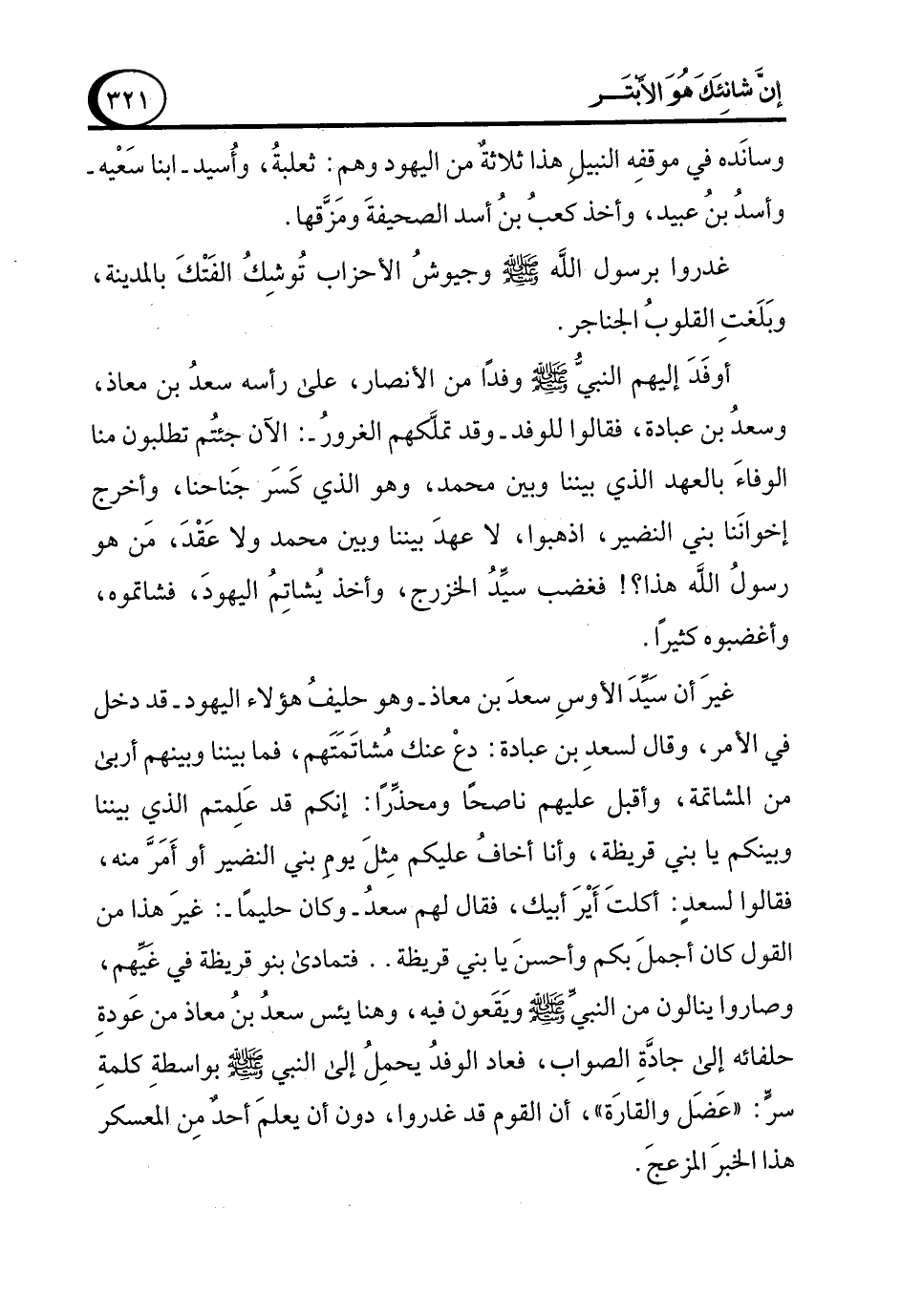 غيرَ أن سَيِّدَ الأوسِ سعدَ بن معاذ -وهو حليفُ هؤلاء اليهود- قد دخل في الأمر، وقال لسعدِ بن عبادة: دعْ عنك مُشاتَمَتَهم، فما بيننا وبينهم أربى من المشاتمة، وأقبل عليهم ناصحًا ومحذِّرًا: إنكم قد عَلِمتم الذي بيننا وبينكم يا بني قريظة، وأنا أخافُ عليكم مِثلَ يوم بني النضير أو أَمَرَّ منه، فقالوا لسعدٍ: أكلتَ أَيْرَ أبيك، فقال لهم سعدُ -وكان حليمًا-: غيرَ هذا من القول كان أجملَ بكم وأحسنَ يا بني قريظة .. فتمادى بنو قريظة في غَيِّهم، وصاروا ينالون من النبيّ - صلى الله عليه وسلم - ويَقَعون فيه، وهنا يئس سعد بنُ معاذ من عَودةِ حلفائه إلى جادَّةِ الصواب، فعاد الوفدُ يحمِلُ إلى النبي - صلى الله عليه وسلم - بواسطةِ كلمةِ سرٍّ: "عَضَل والقارَة"، أن القوم قد غدروا، دون أن يعلمَ أحد مِن المعسكر هذا الخبرَ المزعجَ.